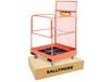 Rugged steel construction for durable, safe use. Safety features include non-skid platform, screen to shield operator from forklift mast, safety chain to secure platform to mast, 42"H. handrails with mid-rail and locking gate. Fork pockets measure 2" x 7" on 29" centers. Standard 4" casters permit easy positioning. Finished in bright orange paint. Ships flat in box for easy assembly. FOB Shipping Point.