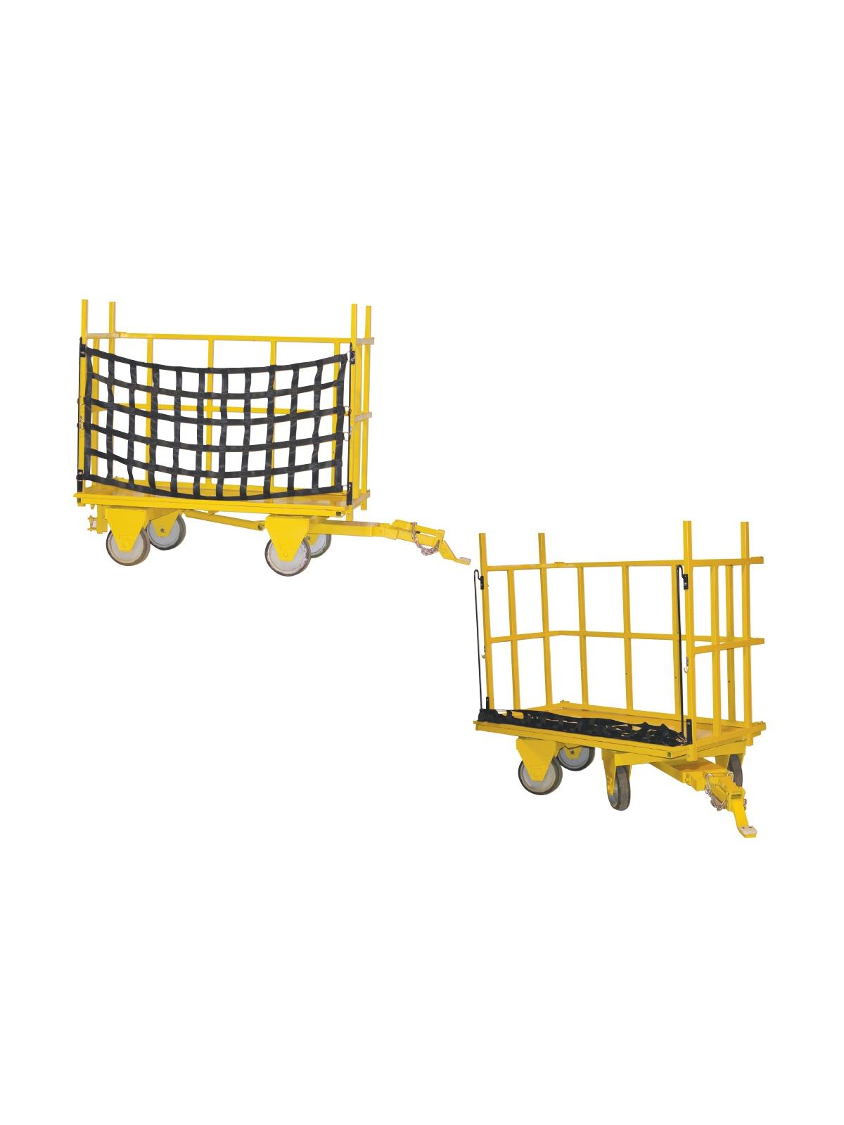Four-Wheel Steer Trailer 36" x 72" with a 2,000 lb. capacity. Three sided cage with easy drop down front net to hold product on cart. Front tongue and rear hitch for towing multiple trailers in train like fashion. Deck height of 11" and 18" available. Premium mold on rubber wheels with precision bearings for minimum maintenance. FOB Shipping Point.