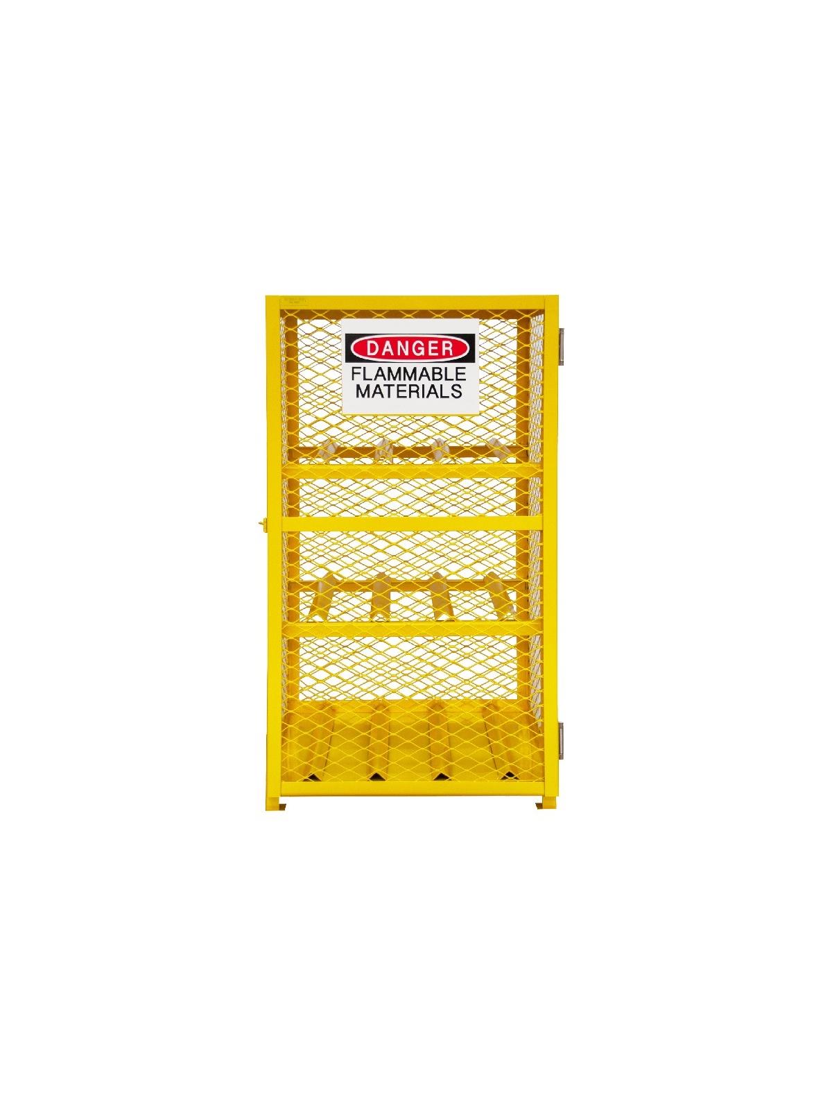 Lockable cabinets store cylinders of fuel, LP gases and other flammable materials on easy-to-access cylinder cradles. "DANGER FLAMMABLE MATERIALS" signs on each door. Magnetic catch keeps doors safely shut when not locked. Heavy-duty butt hinges keep doors from sagging. Includes padlock hasp to secure contents - padlock not furnished. Made of sturdy 1-1/2" x 1/8" angle iron frame. Pre-drilled holes for lagging to floor. Durable, rust and acid resistant safety Yellow powder coat finish. When used properly, units are in full compliance with OSHA and NFPA standards. FOB Shipping Point.
