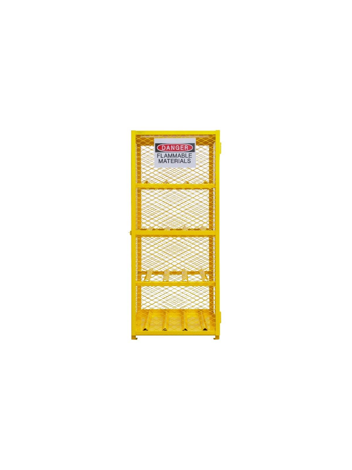 Lockable cabinets store cylinders of fuel, LP gases and other flammable materials on easy-to-access cylinder cradles. "DANGER FLAMMABLE MATERIALS" signs on each door. Magnetic catch keeps doors safely shut when not locked. Heavy-duty butt hinges keep doors from sagging. Includes padlock hasp to secure contents - padlock not furnished. Made of sturdy 1-1/2" x 1/8" angle iron frame. Pre-drilled holes for lagging to floor. Durable, rust and acid resistant safety Yellow powder coat finish. When used properly, units are in full compliance with OSHA and NFPA standards. FOB Shipping Point.