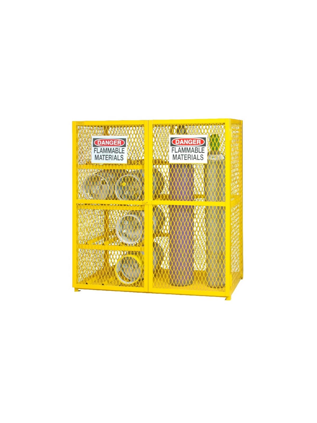 Lockable cabinets store cylinders of fuel, LP gases and other flammable materials on easy-to-access cylinder cradles. "DANGER FLAMMABLE MATERIALS" signs on each door. Magnetic catch keeps doors safely shut when not locked. Heavy-duty butt hinges keep doors from sagging. Includes padlock hasp to secure contents - padlock not furnished. Made of sturdy 1-1/2" x 1/8" angle iron frame. Pre-drilled holes for lagging to floor. Durable, rust and acid resistant safety Yellow powder coat finish. When used properly, units are in full compliance with OSHA and NFPA standards. FOB Shipping Point.