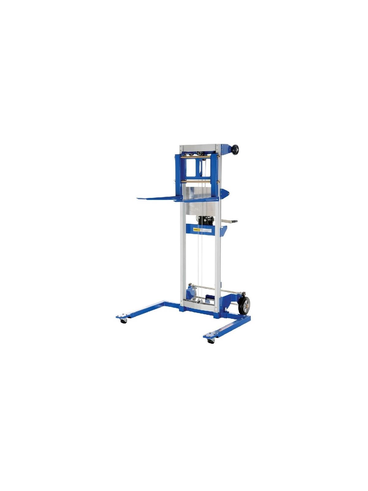 Operated by a hand-crank winch that features a reversible handle and a hold-down device for securing the carriage during transport. Forks can be inverted to provide 2 different heights. Rugged thick steel forks are 4"W x 1-3/4" thick and forks measure 20-1/2"W x 22"L overall. Truck is made of durable steel-and-aluminum. Two 8" non-marking rear wheels, two 2" front swivel casters. Counter balanced design has poly-on-poly wheels, (2) 5" rear swivel wheels, (2) 4" front wheels. Models ending with 'HP' and 'EHP' suffixes have extended height capabilities. These units have a 2 stage mast system and a telescoping inner mast frame, giving the user the ability to extend the forks above the height of the first mast. FOB Shipping Point.