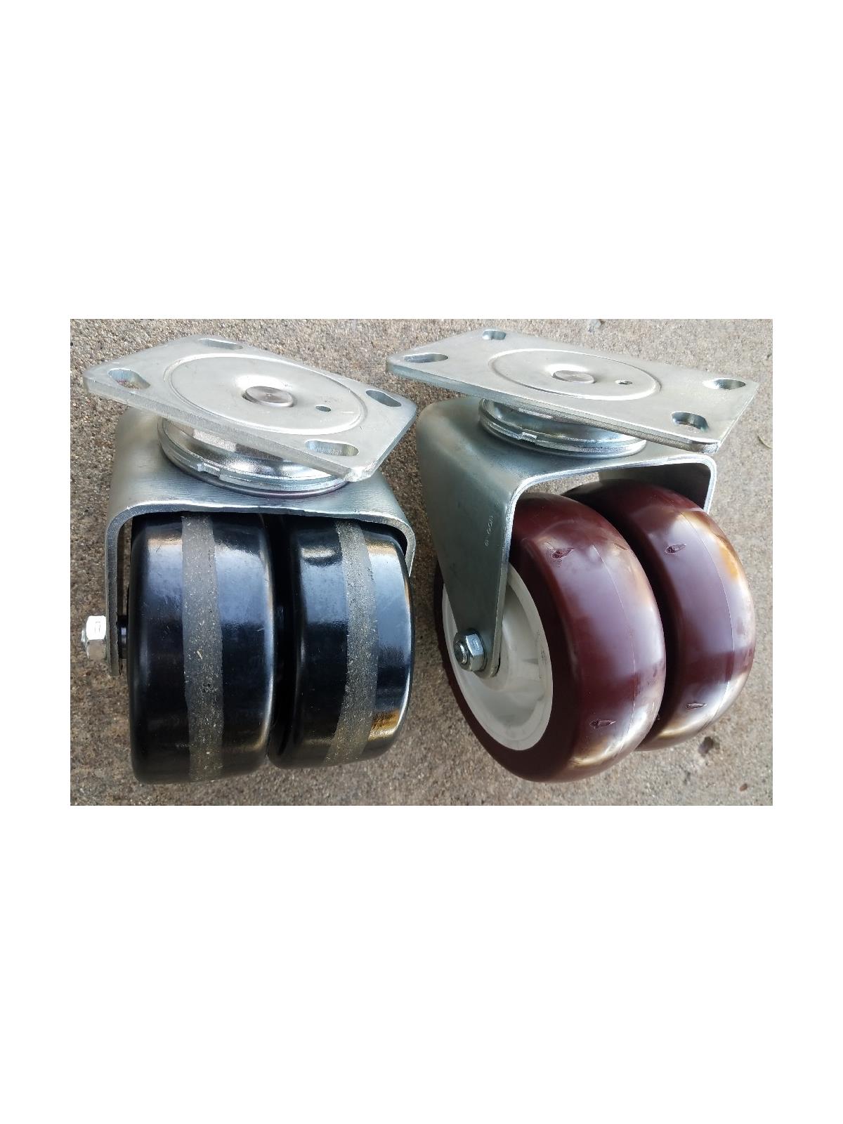 Dual casters make rolling and turning heavy loads easier than a single wheel. Double the floor contact and when turning a corner, one wheel rotates forward, while the other rotates backward (differential action) making this the preferred mode for manual operations with loads from 500 to 4000 lbs. FOB Shipping Point. Standard top plate measures 3-3/4" x 4-5/8", bolt hole is 2-5/8" x 3-5/8", slotted 3" x 3". Large C top plate measures 4-1/2" x 6-1/4", bolt holes 2-7/16" x 4-15/16", slotted 3-3/8" x 5-1/4" (-C in Product No.) Steel surcharge may apply. Wheel Description PLEXITE - Black phenolic. MIRATEK - Red 95 duropoly.