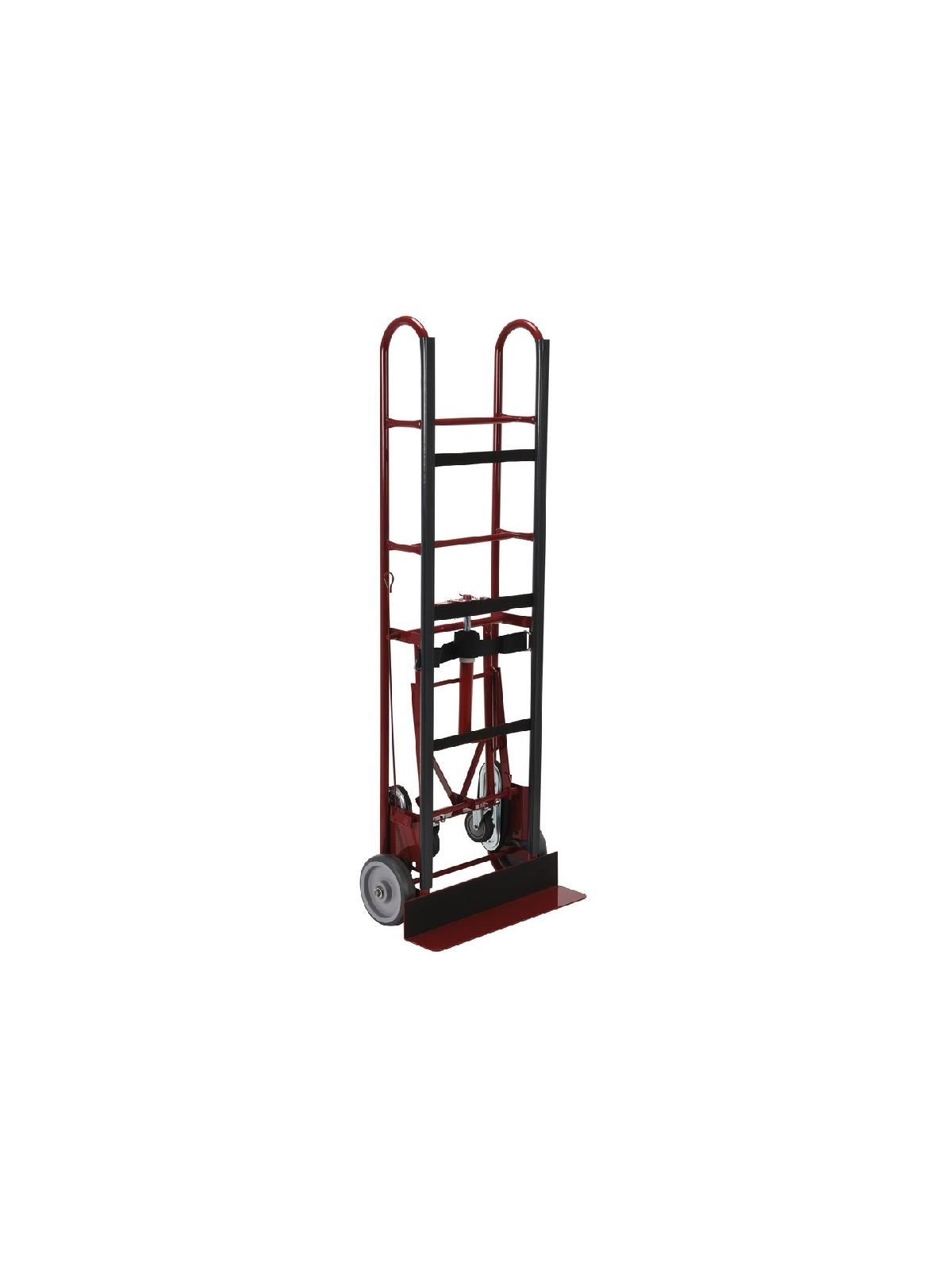 J) Powered Stair Climber...Powered Stair Climber powered with electric lifting/lowering system is ideal to transport light to medium duty and awkward loads up and down stairs. Ideal for copiers, copy paper, filing cabinets, furniture and appliances. Stair climber handles the load up/down stairs and the operator only balances the load. Combined powered stair climber and hand truck that is light weight but lifts load 10 times more than its own weight. Brake activates automatically when going down stairs. Ergo handle with easily accessible raise/lower switch. Folds down to approximately 31". Equipped with maintenance-free 48V/8.8 Ah light weight, high quality and easy to replace Lithium-ion battery. Built-in battery charger indicator. Durable aluminum alloy construction.