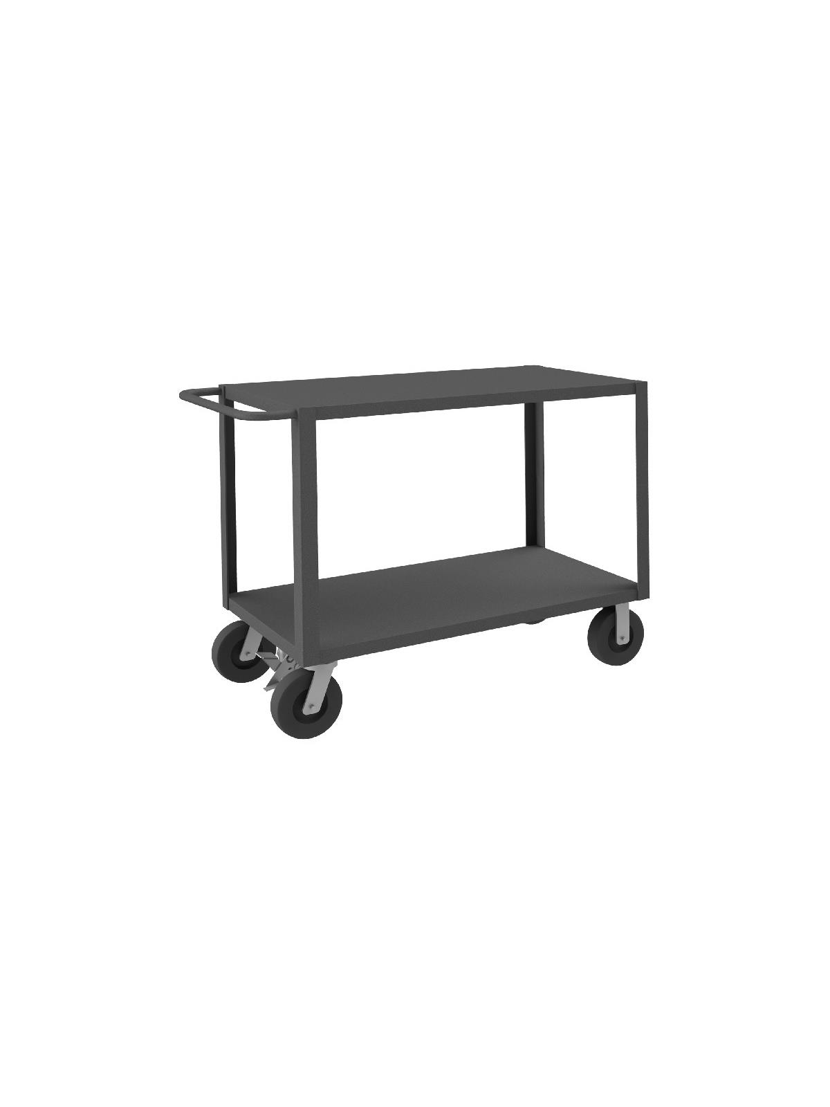 Heavy Duty Portable Tables have a 2" x 3/16" angle iron frame for added strength. Shelves are reinforced and have lips down. (2) swivel and (2) rigid bolt-on casters. Sturdy tubular push handle for easy maneuverability. 4,000 lbs. capacity unit has welded 14 gauge steel shelves with channel formed sides. 5,000 lbs. capacity unit has welded 12 gauge steel shelves. FOB Shipping Point.
