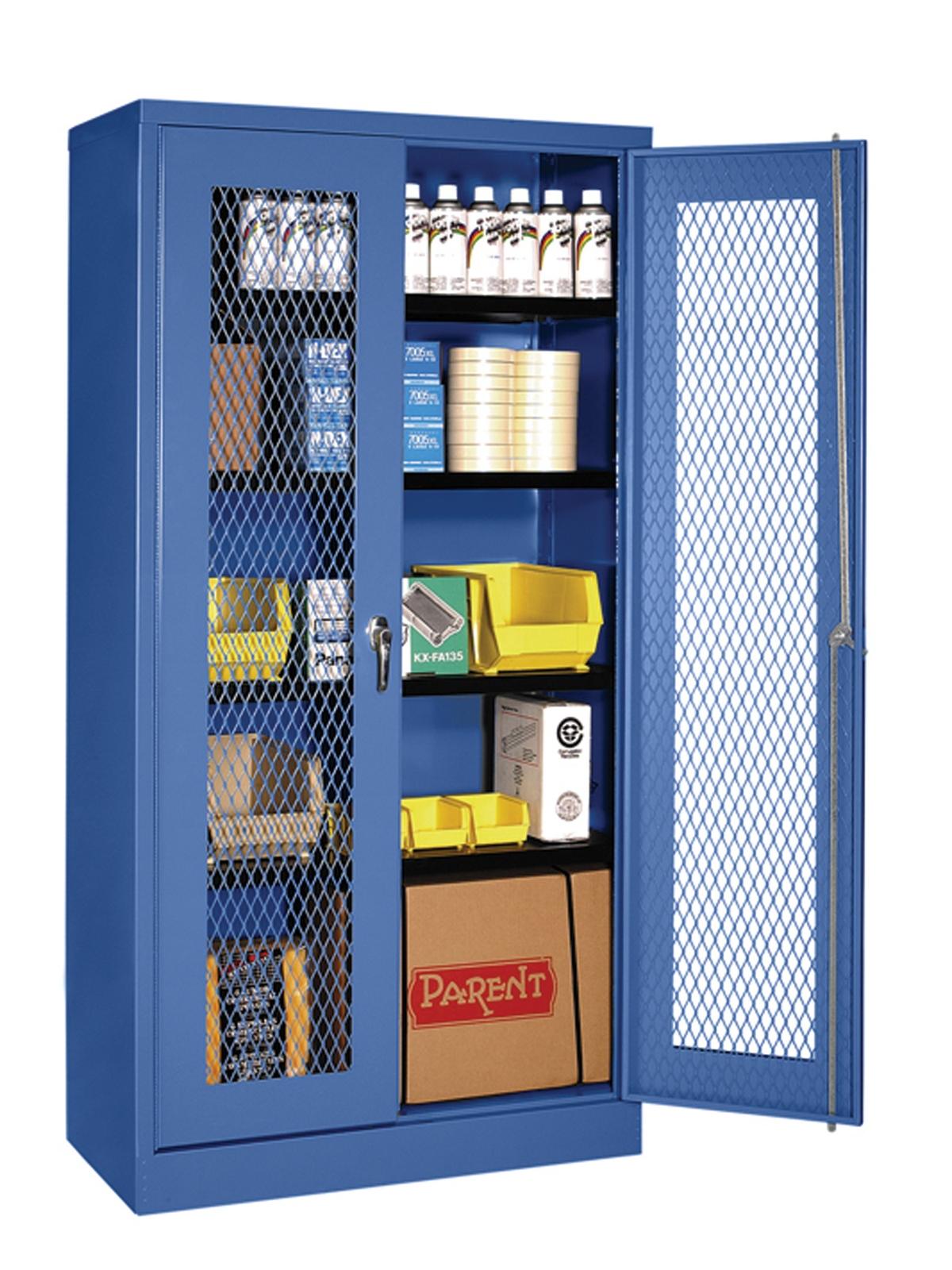 Features expanded metal door fronts for quick content identification and air circulation. Doors are 16 ga. with full height piano hinge. Shelves are 18 ga. with 400 lb. capacity each - adjustable on 2" centers. 3 point locking device with plated locking bars. Includes 2 handles with keys - 1 locking, 1 fixed. Durable Light Gray and Blue powder coat finish. FOB Shipping Point.