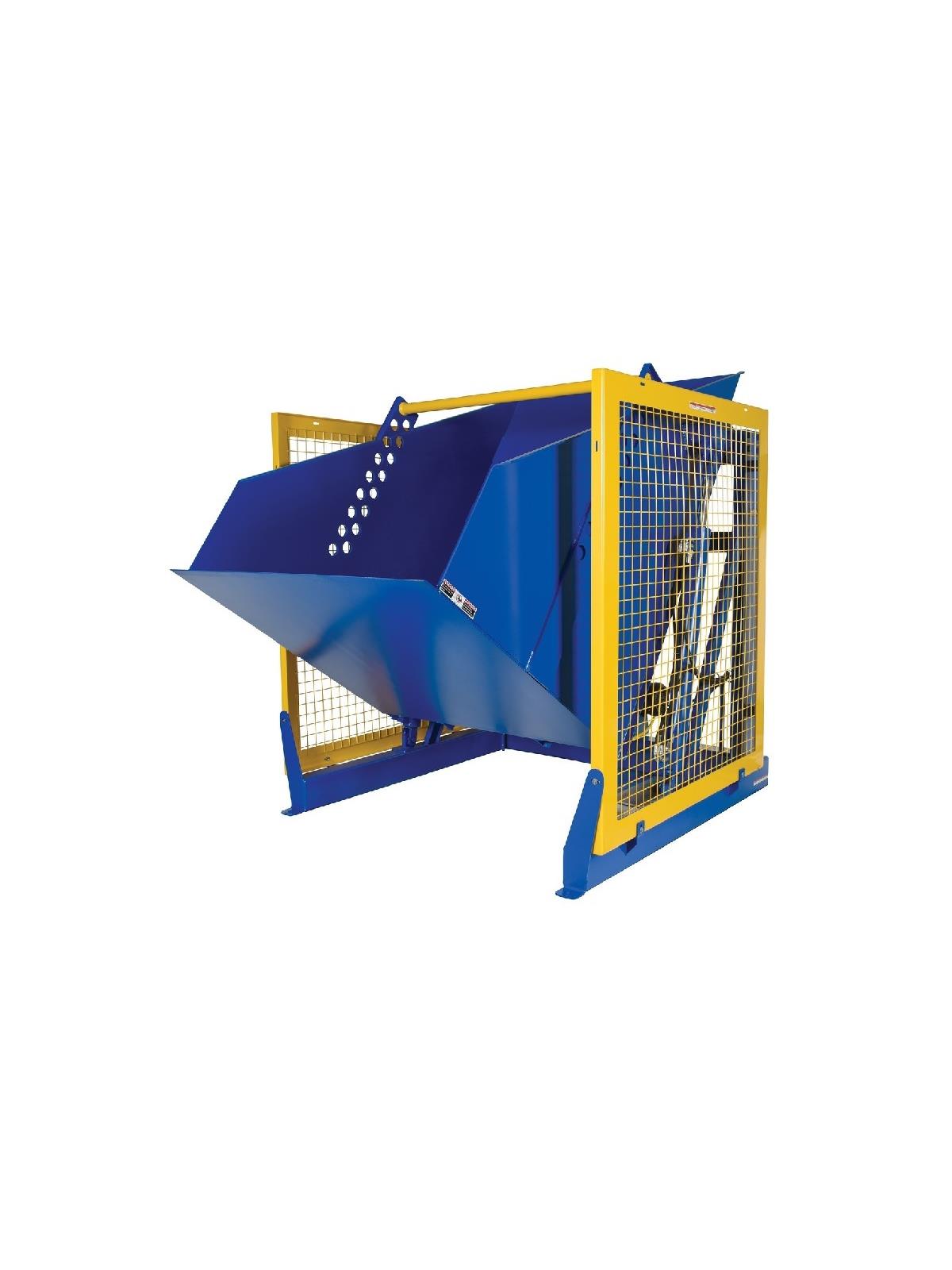 This ultimate dumper has advanced features from solid all welded steel construction to the Emergency Brass Velocity fuse in the cylinder. Main components include a 24V hand held pendant control, 56 frame motor, upper travel limit switch to reduce wear on the components. Safety features include: side rail guards, floor hold down brackets, adjustable hold down bar, 3,000 psi hydraulic component rating, integrated brass velocity fuse mounted inside the cylinder. Maximum rotation is 135°, yielding a 45° dump angle. Painted Royal Blue. FOB Shipping Point.