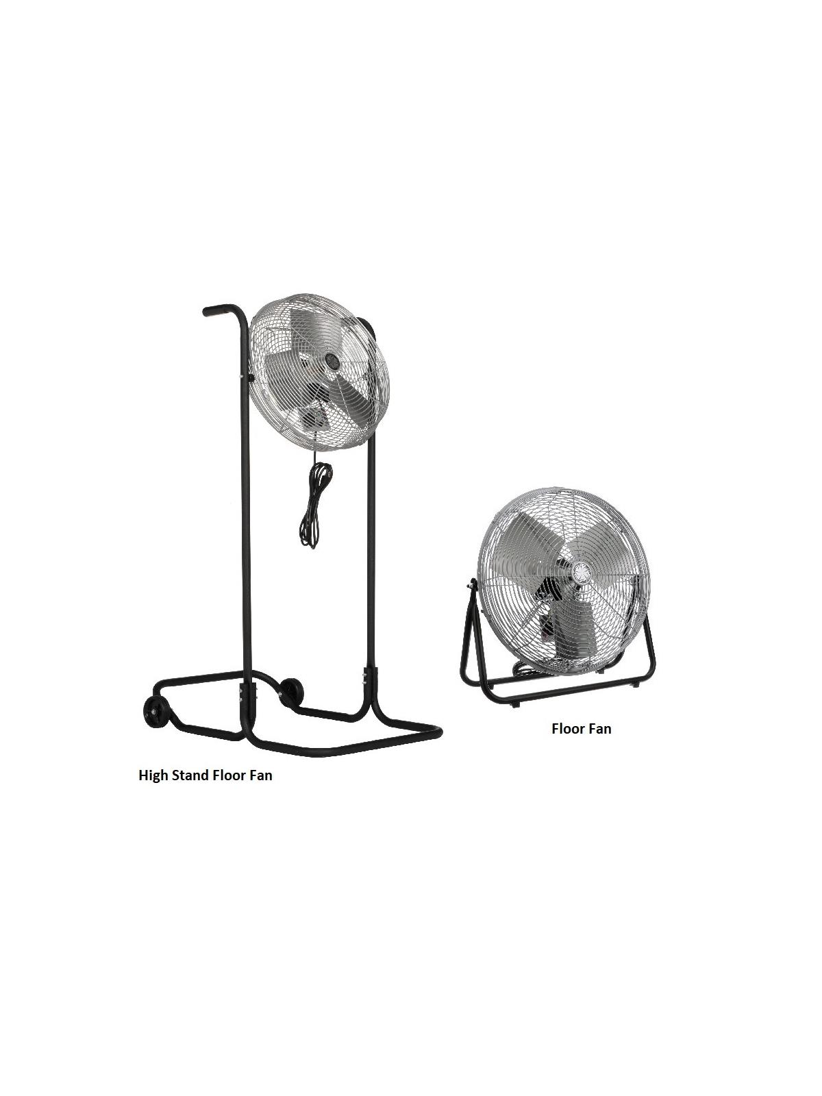 Motor is dependable 3-speed, 1 phase, 115V ball bearing totally enclosed permanently lubricated. Rotary switch. Aluminum blade has a steel hub. Safety guards are double locking chrome plated. Cord is SJT type 3 conductor, 10'L. Rolls on 5" hard rubber wheels. Meets OSHA standards. ETL C/US listed. FOB Shipping Point.