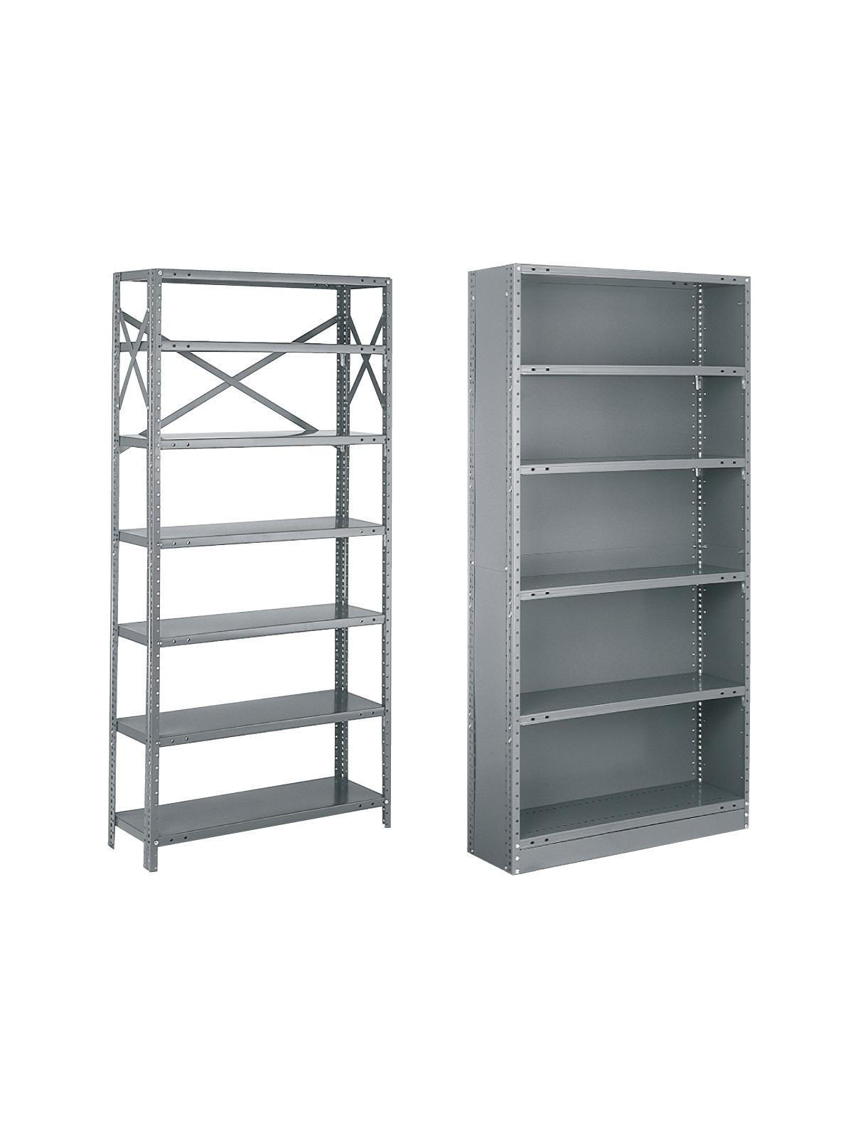 These rugged and dependable shelving units deliver real supporting strength for all types of storage uses. Offset angle post support heavy loads and accommodate compression clips. Sturdy formed shelf is made from cold rolled steel and has "Triple Bends" on all four sides for incomparable strength. Features a rust resistant phosphatized cleaning for better paint adhesion and durability. Baked-on gray enamel finish. Compression clip rapidly snaps into post which allows for independent adjustment of shelves – normal shelf loading increases the locking action. Closed units feature back and end panels. Starter units include 2 – sway braces; Add-on units include 1 sway brace. FOB Shipping Point. Plus Applicable Steel Surcharge
