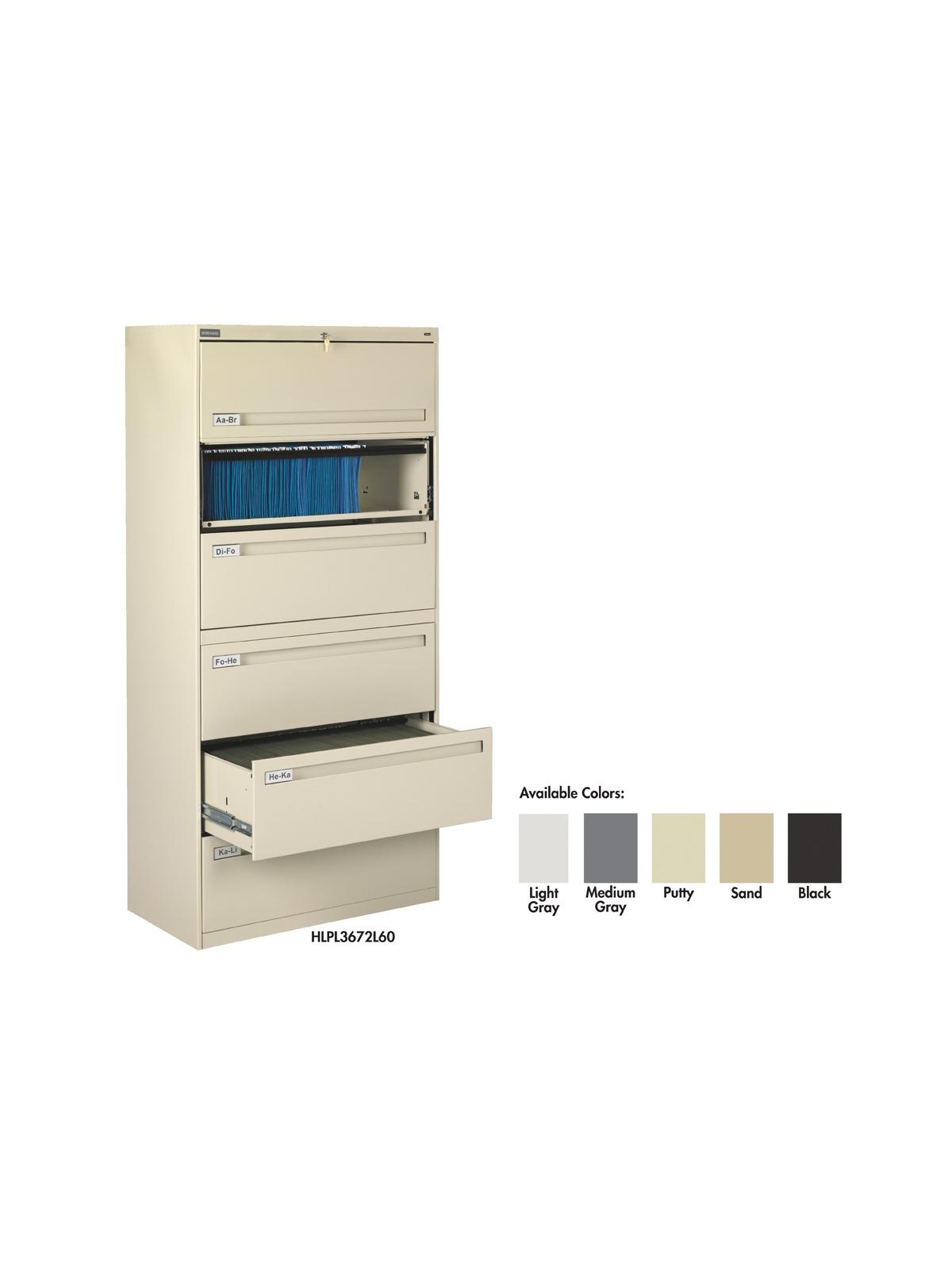 Drawers and doors have easy grip, full-width pulls with recessed label holders. Four leveling glides allow the unit to be leveled on uneven floors. To reduce risk of tipping, order two drawer lateral files with counterweights (suffix "W") for all applications except under a work surface in a workstation. Five and six-high units have retractable door(s) with roll-out drawer on top opening(s). Durable powder-coat paint finish. Available in Light Gray, Medium Gray, Putty, Sand and Black. FOB Shipping Point.