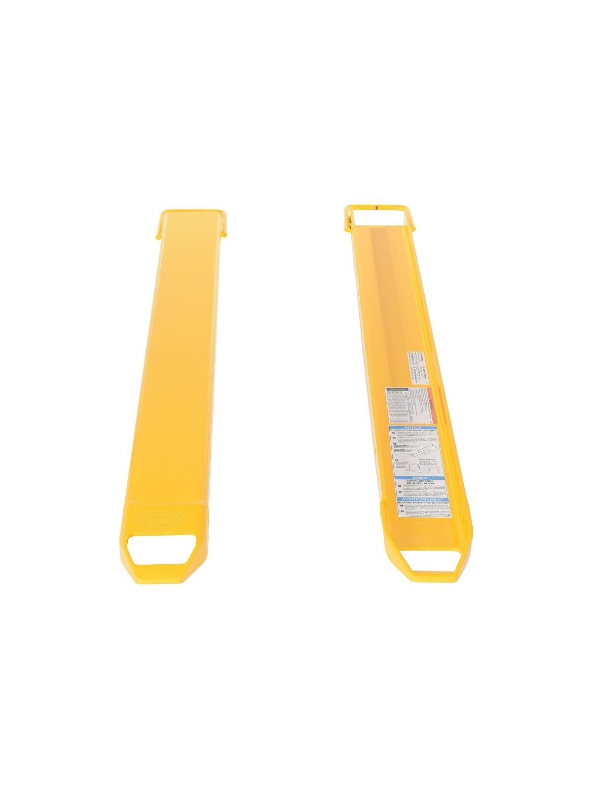 Rugged and durable welded steel construction with cast steel fork tips. Steel retaining strap prevents fork extensions from sliding off forks during use. Extensions are put on by sliding them up the fork at a 45° angle. OSHA regulations require that extensions are no more than 150% of the existing fork length. Powder coat Yellow finish. FOB Shipping Point.