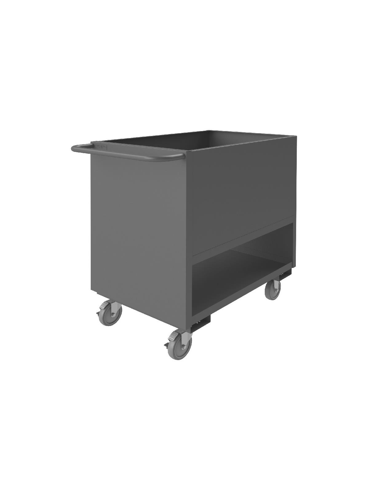 Holds 1200 lbs. of supplies. Built of 1-1/2" angle iron frame, 14 ga. steel shelves and sides. Easy rolling on 5" x 1-1/4" polyurethane bolt on casters, 2 swivel, 2 rigid. Overall height 40", platform is 20"H. Gray powder coat finish. FOB Shipping Point.