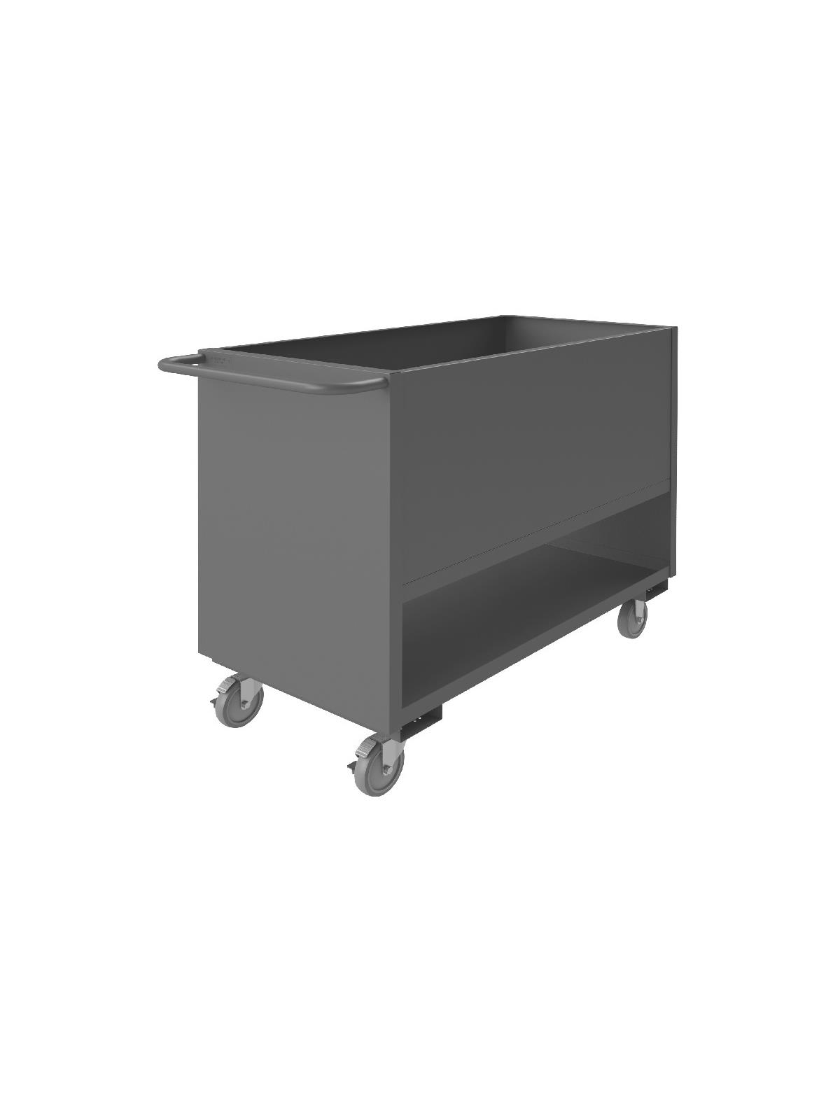 Holds 1200 lbs. of supplies. Built of 1-1/2" angle iron frame, 14 ga. steel shelves and sides. Easy rolling on 5" x 1-1/4" polyurethane bolt on casters, 2 swivel, 2 rigid. Overall height 40", platform is 20"H. Gray powder coat finish. FOB Shipping Point.