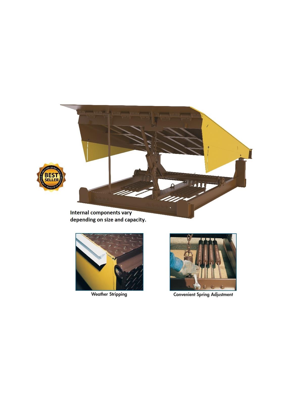 Springs lift dock through a graduated cam ensuring a uniform vertical force. Easy walk down. All heavy duty construction features. Platform is 1/4" non-skid diamond plate (55,000 PSI) steel. 6" structural steel support under-structure for long life. Lip is 16" long with 55,000 PSI steel. Includes steel toe guards on both sides, flush with platform edge. The most dependable dockleveler on the market today. 20,000 lb. load capacity. Capacities to 50,000 lbs. available. Contact for details. FOB Shipping Point.
