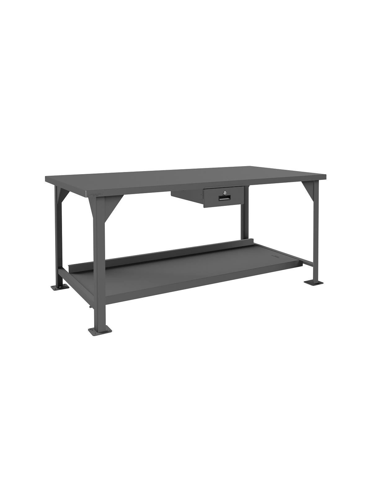 Workbench top is 12 gauge thick reinforced steel. Has angle iron stiffener under work surface and 2" x 2" x 1/4" angle iron legs. Mobile units (DWBM) include (4) 3" phenolic, locking swivel casters. Back and end stops. All units have provisions for optional drawer to be added. Work surfaces are 34" above the floor. All models include a 12 gauge steel lower shelf with 500 lbs. capacity. Foot pads with predrilled holes allow for lagging to the floor. FOB Shipping Point.