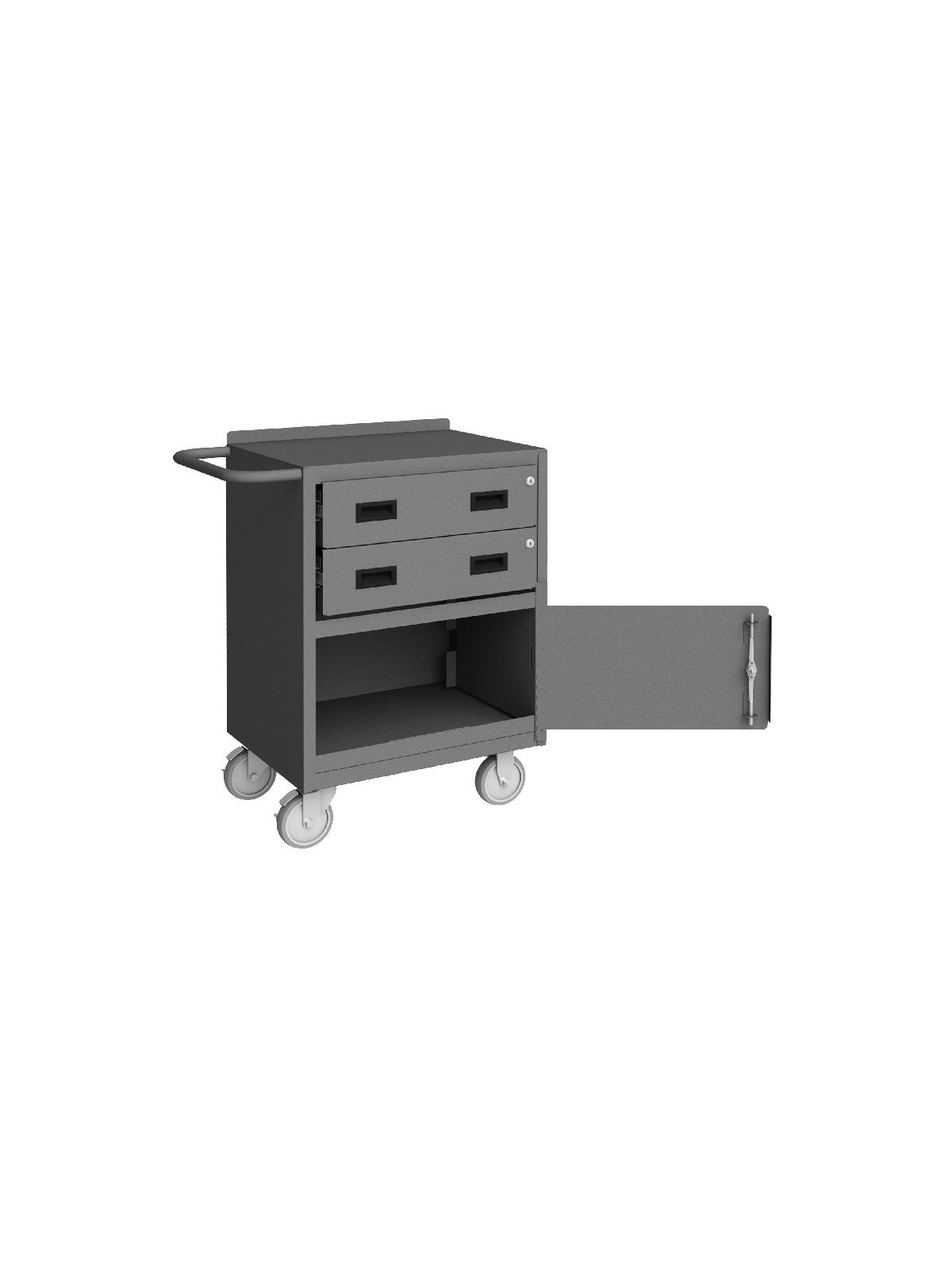 Unit features back and end stops on the work surface. Bolt-on 5 x 1-1/4" polyurethane casters, 2 swivel and 2 rigid with side brakes. Cabinet compartment comes equipped with one adjustable shelf and a keyed handle with 3 point locking system. Models with -TH in the part number include a work surface with 1/4" thick tempered hardboard. Drawers measure 20-7/16" W x 14-11/16" D x 5-7/8" H. Ships fully assembled and ready to use. FOB Shipping Point.