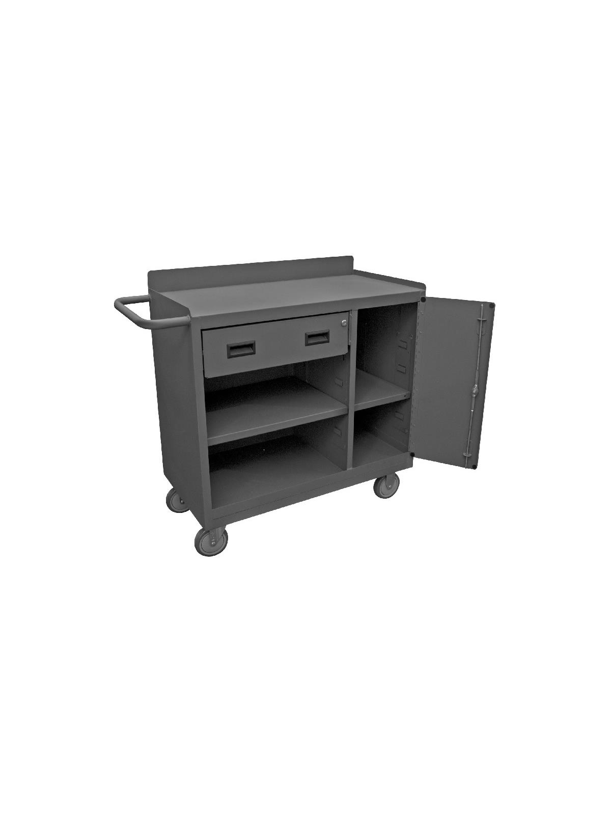 Unit features back and end stops on the work surface. Bolt-on 5 x 1-1/4" polyurethane casters, 2 swivel and 2 rigid with side brakes. Cabinet compartment comes equipped with one adjustable shelf and a keyed handle with 3 point locking system. Models with -TH in the part number include a work surface with 1/4" thick tempered hardboard. Drawers measure 20-7/16" W x 14-11/16" D x 5-7/8" H. Ships fully assembled and ready to use. FOB Shipping Point.