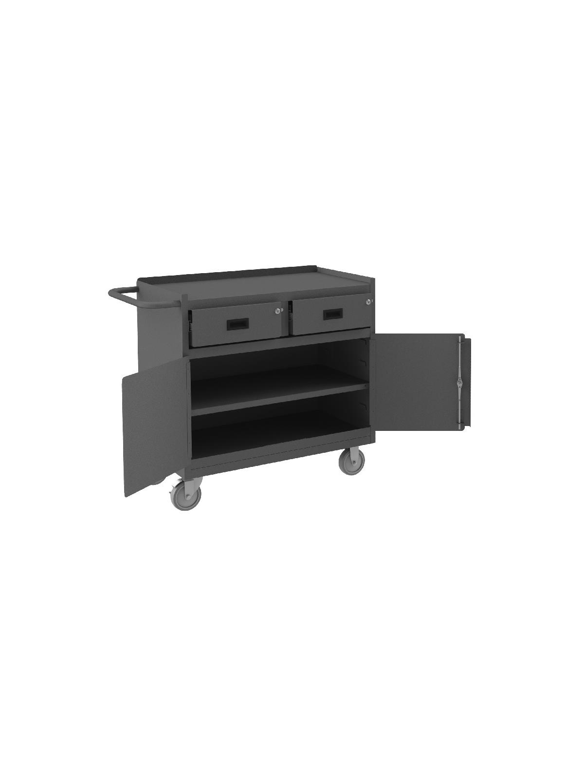 Unit features back and end stops on the work surface. Bolt-on 5 x 1-1/4" polyurethane casters, 2 swivel and 2 rigid with side brakes. Cabinet compartment comes equipped with one adjustable shelf and a keyed handle with 3 point locking system. Models with -TH in the part number include a work surface with 1/4" thick tempered hardboard. Drawers measure 20-7/16" W x 14-11/16" D x 5-7/8" H. Ships fully assembled and ready to use. FOB Shipping Point.