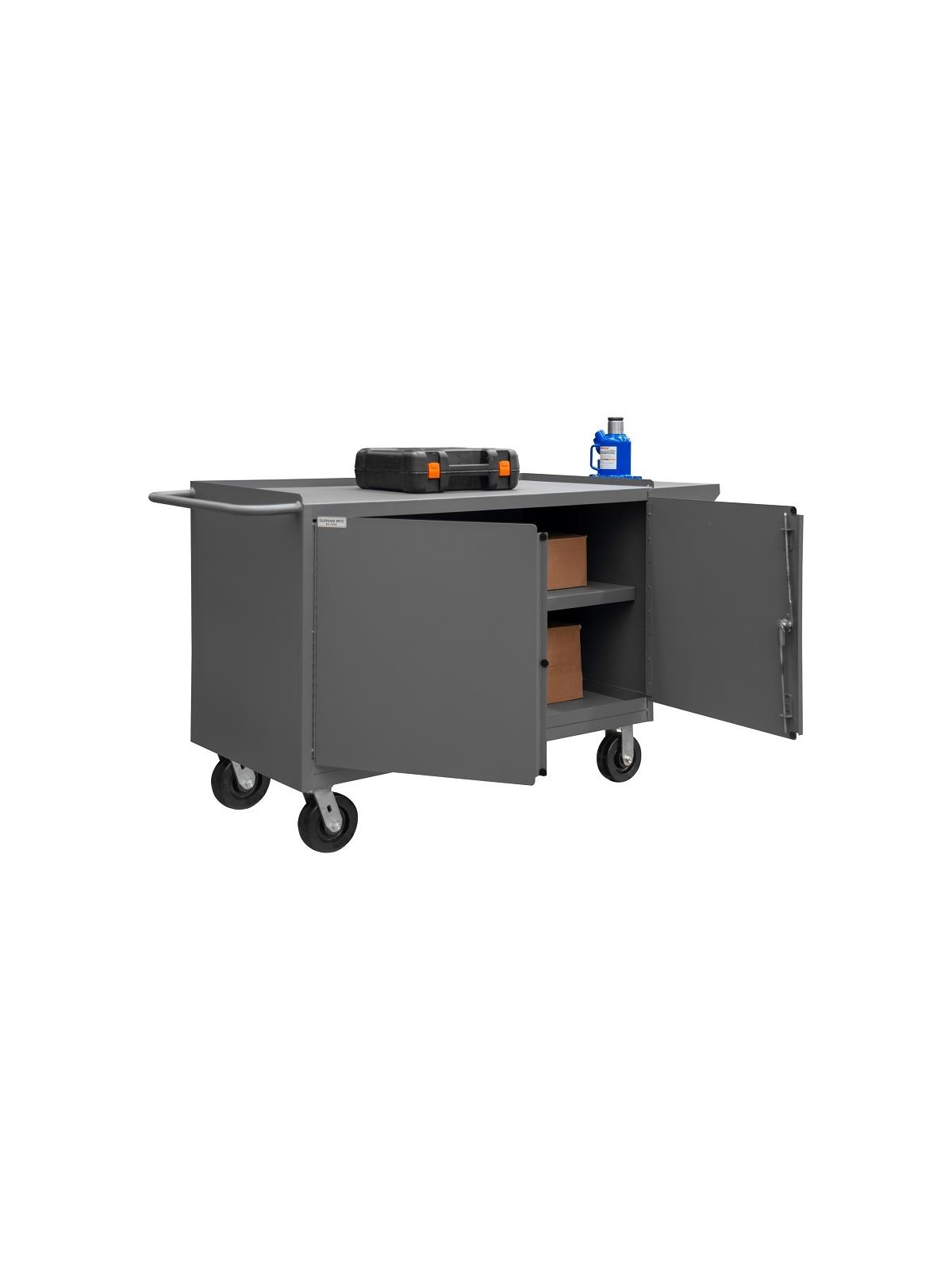 Choose from two models to store, sort and organize. High capacity, heavy-duty mobile cabinets combine storage, security, mobility and a work surface. Ideal for factories, warehouses or offices. Doors swing effortlessly, thanks to full length piano hinges. Doors also feature three-point locking handle and two keys. Casters are 6" x 2" phenolic bolt-on, two swivel and two rigid. Capacity of 2,000 lbs. Gray powder coat finish. FOB Shipping Point.