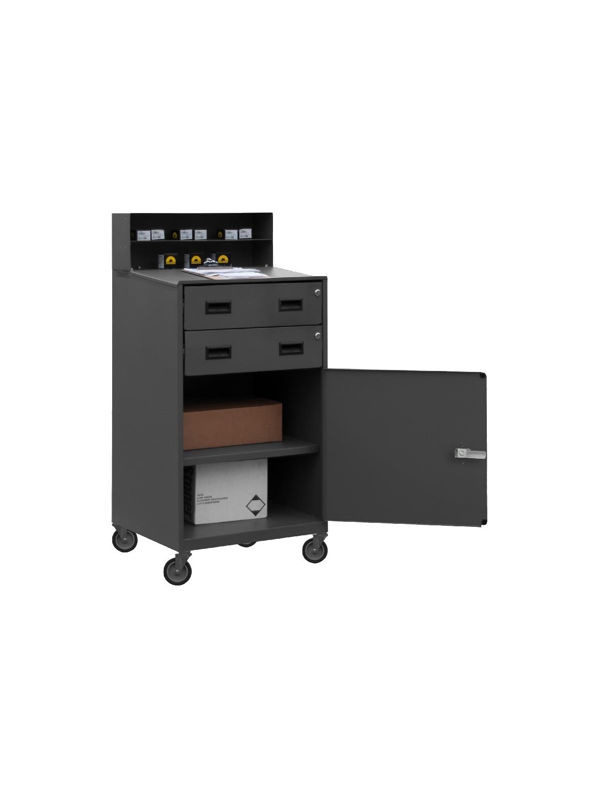 HFED-2023-95 - Features 2 sliding drawers with compartments for storing pens, pencils and more. Lower storage compartment has a single point locking handle. 2 keys are provided. Lip at base of work surface keeps items from falling off sloped top. Rolls on four 3" rubber swivel plug-in casters. Gray powder coat finish. Minimal assembly required.