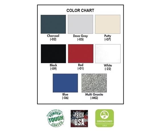 Casters are positioned to permit flush positioning to walls. Includes extra deep adjustable shelves to provide nearly 40% more storage space than standard models. Cabinets close with three point recessed locking handle. Solid welded steel construction yields years of hard working service. Durable finish. Available in five standard colors: Charcoal (-02), Dove Gray (-05), Putty (-07), Textured Black (-09), Blue (-06) and Textured Red (-01). Custom colors available for an upcharge - call for information. Ships assembled except for lock rods and casters. FOB Shipping Point.