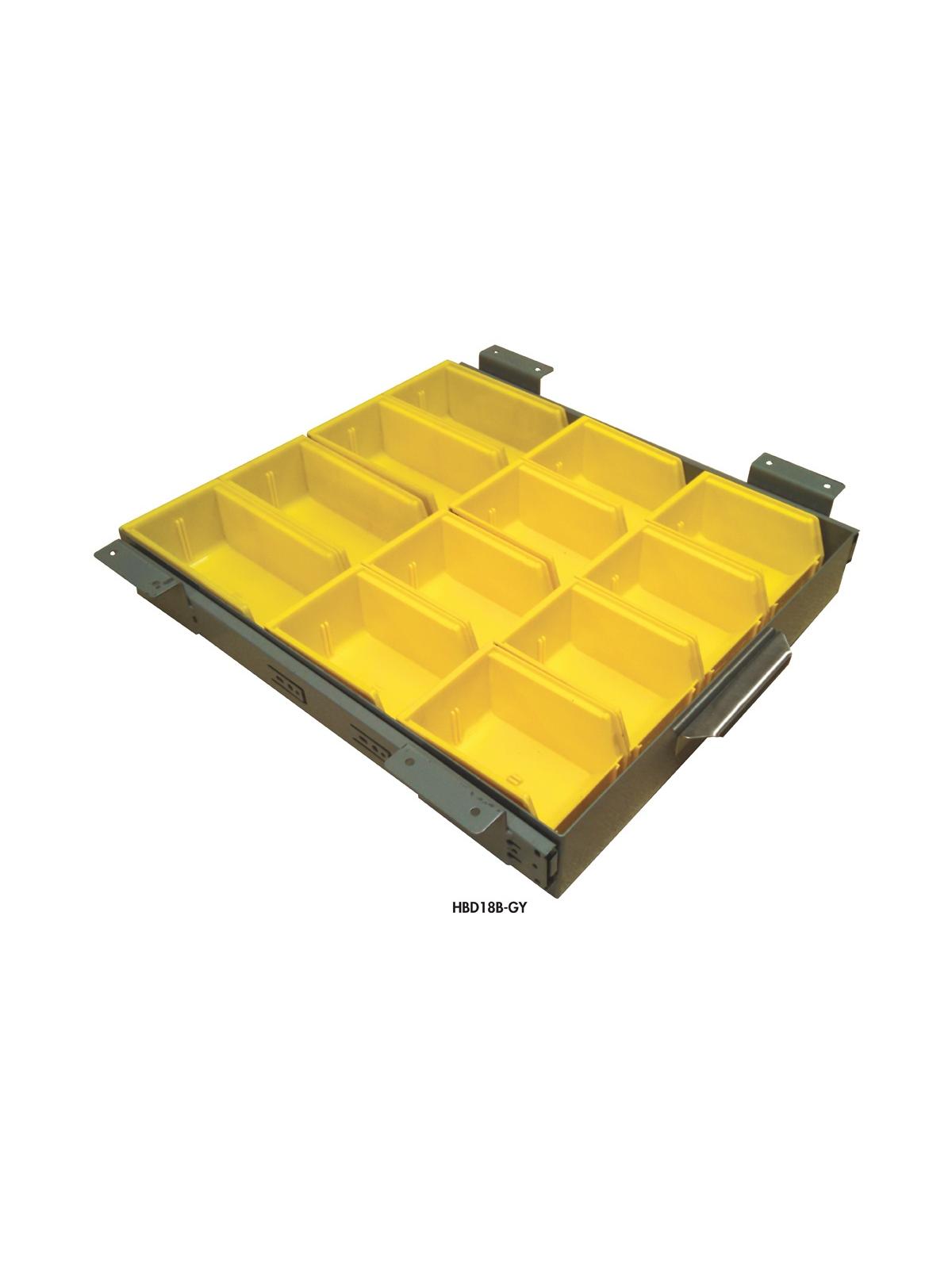 18" Bin Drawer includes eight 3 x 5 x 4" bins and four 3 x 7 x 4" bins, yellow in color. Bin Drawer steel color options are Gray, Blue and Black. FOB Shipping Point.