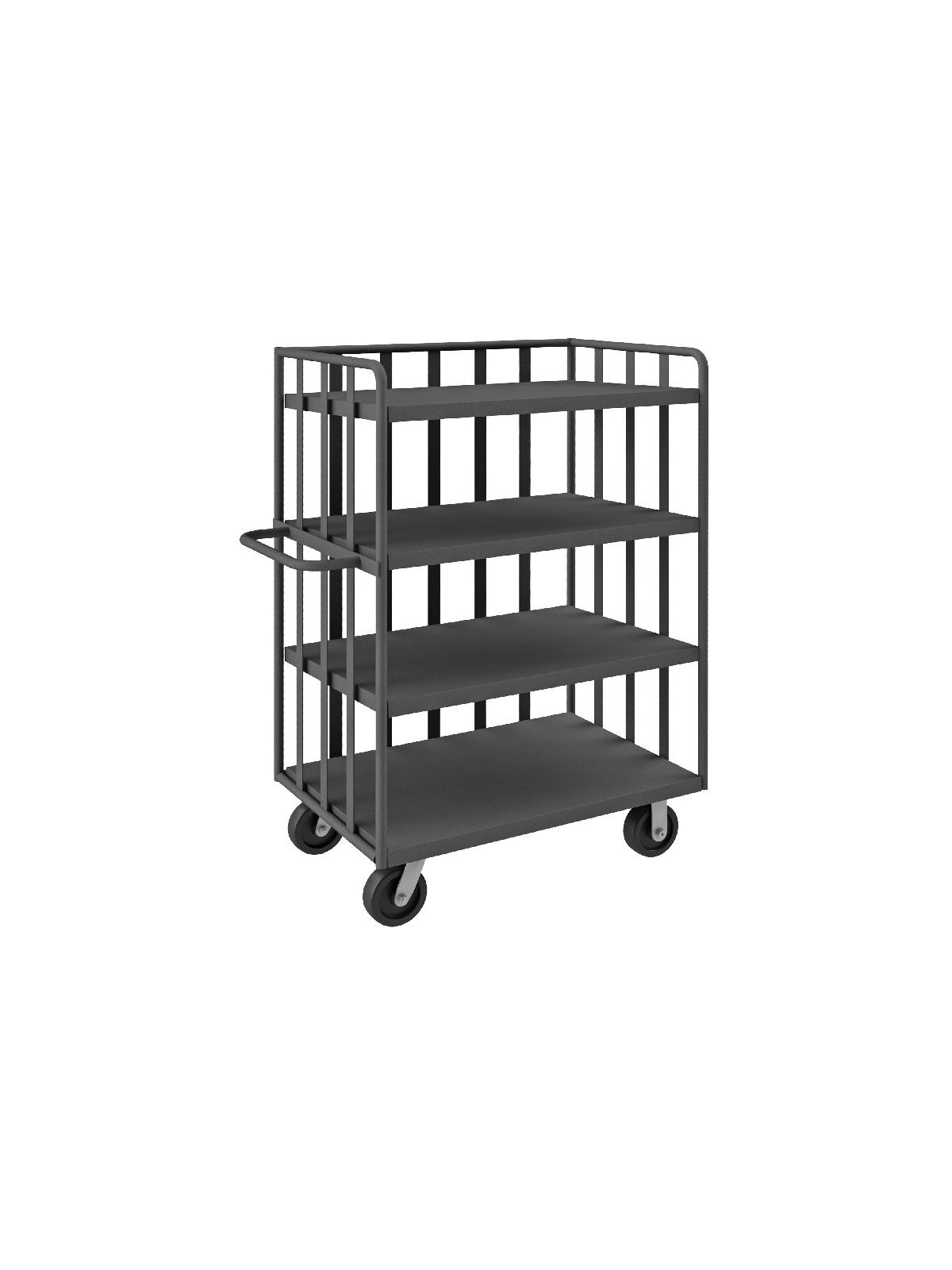 Built for heavy 2000 lb. loads. Frame is made from 1" steel tubing. 1/2" rods on sides and back. 14" clearance between shelves. Steel shelves slope 1" from front to rear preventing contents from falling off during transport Shelves are made of 14 ga. steel. Smooth rolling 6" x 2" phenolic bolt-on casters, 2 swivel, 2 rigid. All units are 58"H. Gray powder coat finish. FOB Shipping Point.