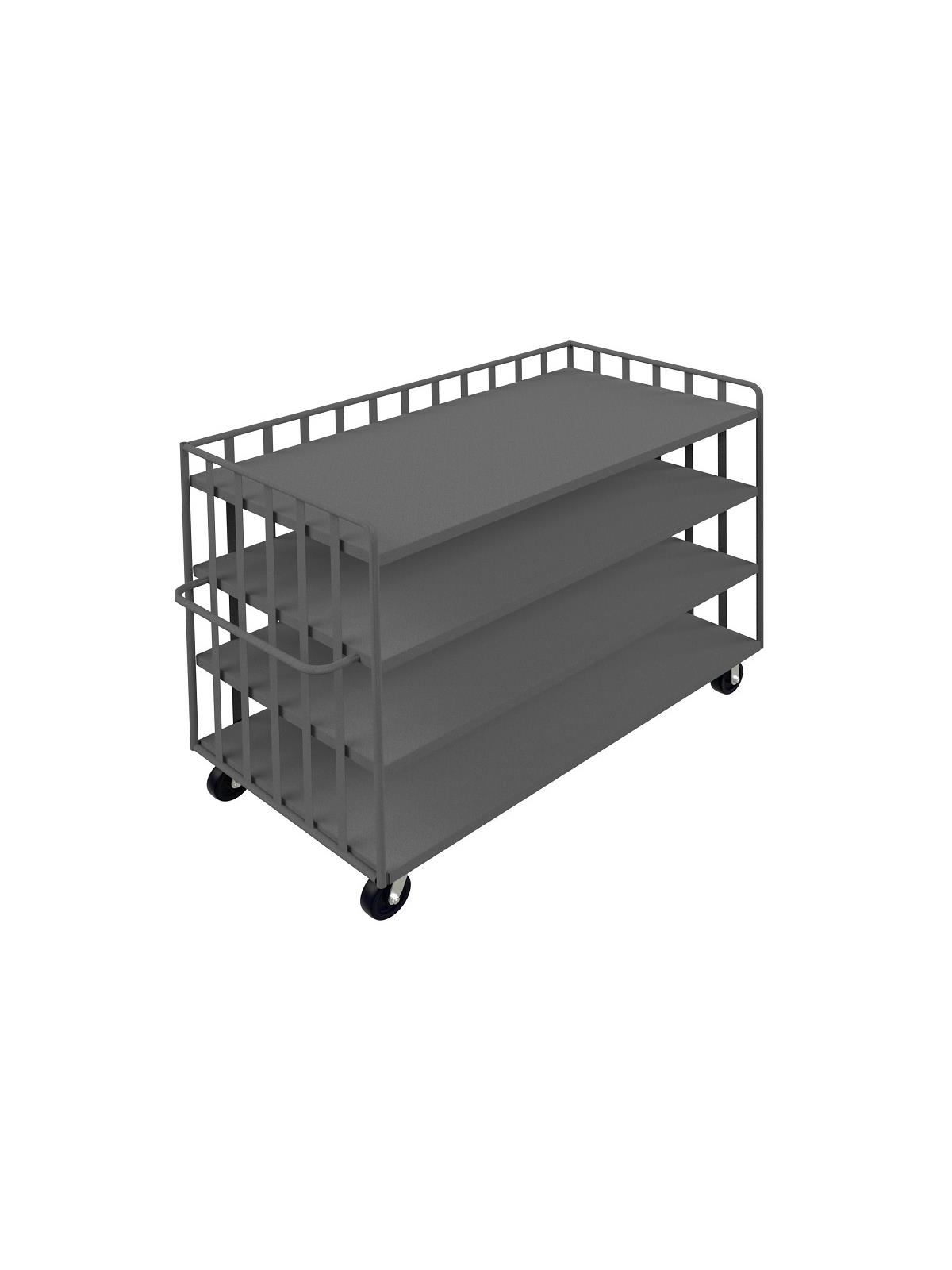 Built for heavy 2000 lb. loads. Frame is made from 1" steel tubing. 1/2" rods on sides and back. 14" clearance between shelves. Steel shelves slope 1" from front to rear preventing contents from falling off during transport Shelves are made of 14 ga. steel. Smooth rolling 6" x 2" phenolic bolt-on casters, 2 swivel, 2 rigid. All units are 58"H. Gray powder coat finish. FOB Shipping Point.