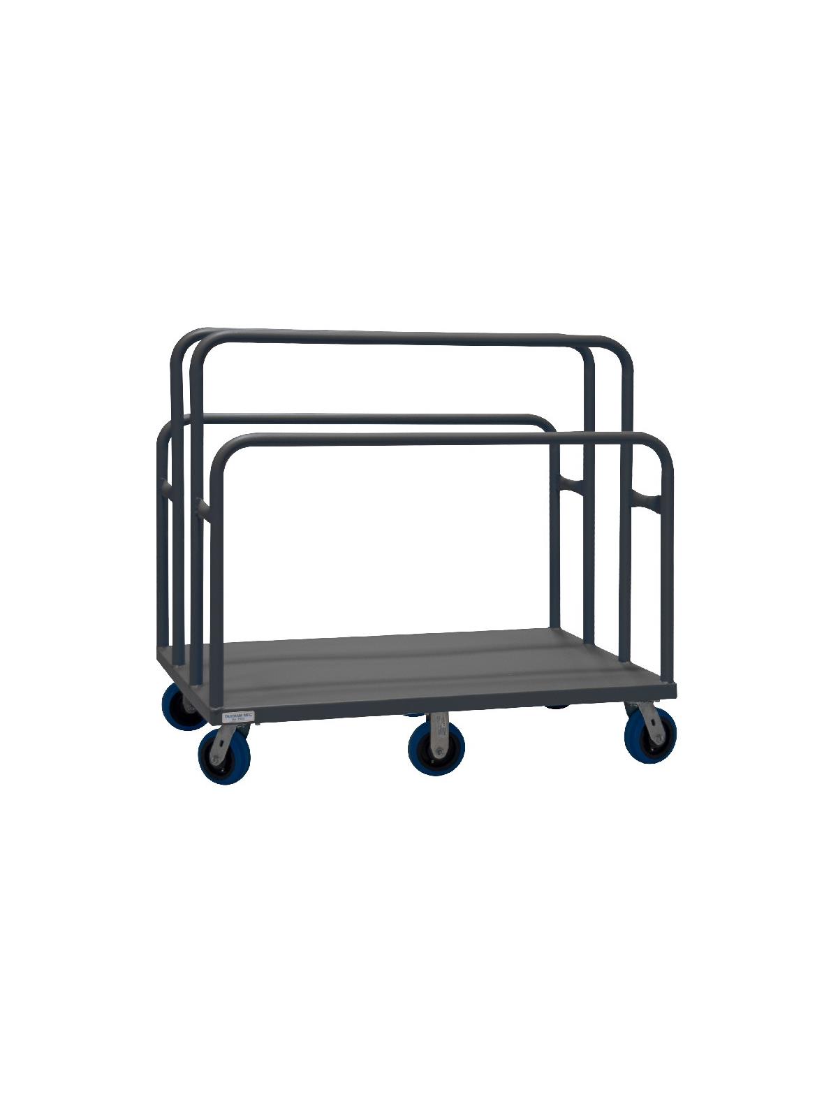 Heavy duty, 14 gauge, steel platform. Easy to access and pick up on-board product. Allows for the storage and transportation of various sizes of panels & products. Durable, gray, textured powder coat finish. FOB Shipping Point.