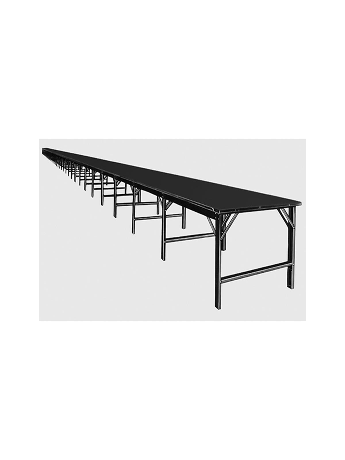 Heavy 12 ga. steel interlocking frame has smooth rolled edges throughout. Parallel apron rails form a permanent top and track edge. Adjustable legs raise top from 33 - 37"H. Invisible steel spline clamping bars connect tops to form a smooth continuous surface. Tops in either hardboard or plastic laminate over high density flake core. Ships KD. FOB Shipping Point.