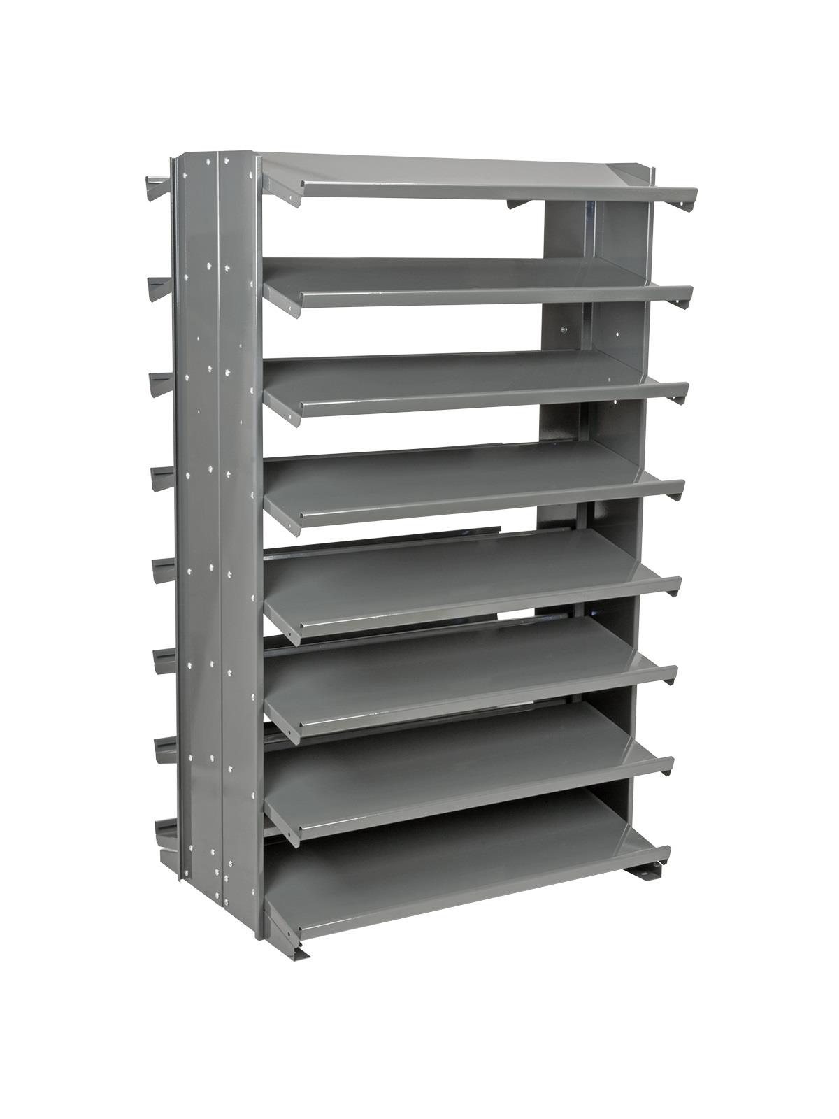 Angled shelves keep small parts in the front of the bins for easy viewing and picking. Convenient heavy-duty storage. Handsome Gray baked-enamel finish. Bins available in Red, Yellow, Blue, Green, or Semi-Clear. FOB Shipping Point.