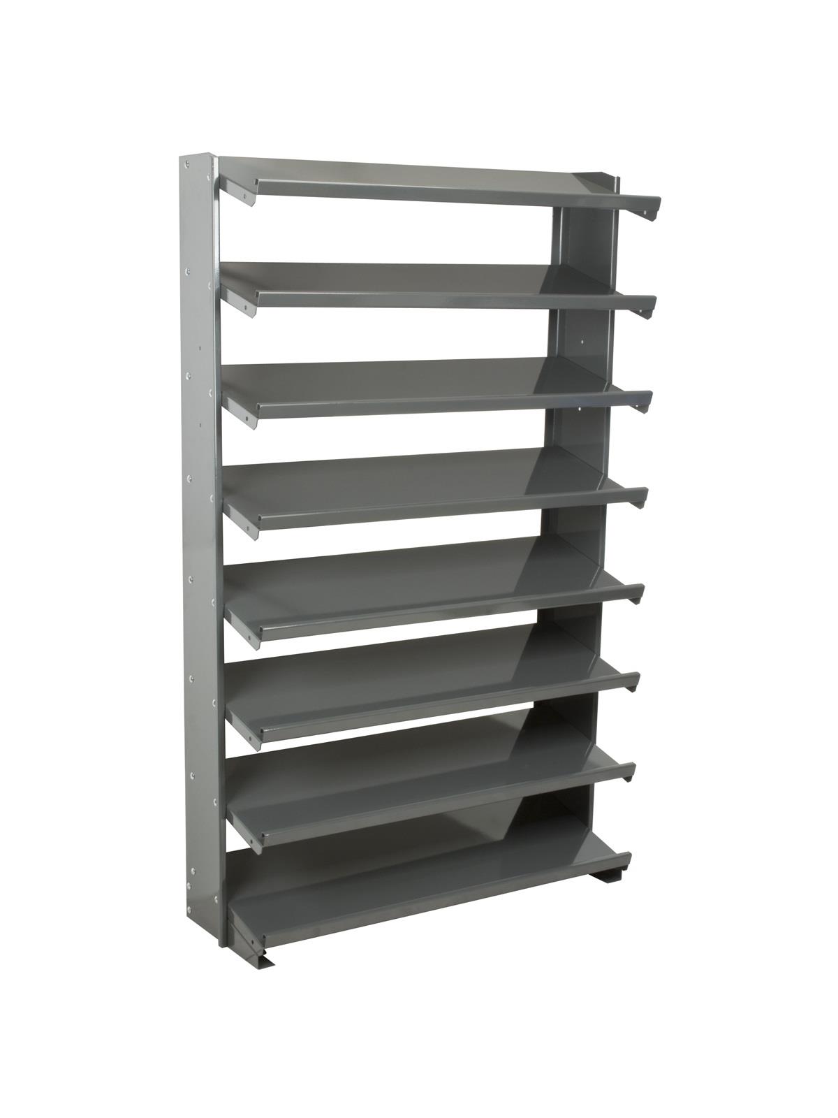 Angled shelves keep small parts in the front of the bins for easy viewing and picking. Convenient heavy-duty storage. Handsome Gray baked-enamel finish. Bins available in Red, Yellow, Blue, Green, or Semi-Clear. FOB Shipping Point.