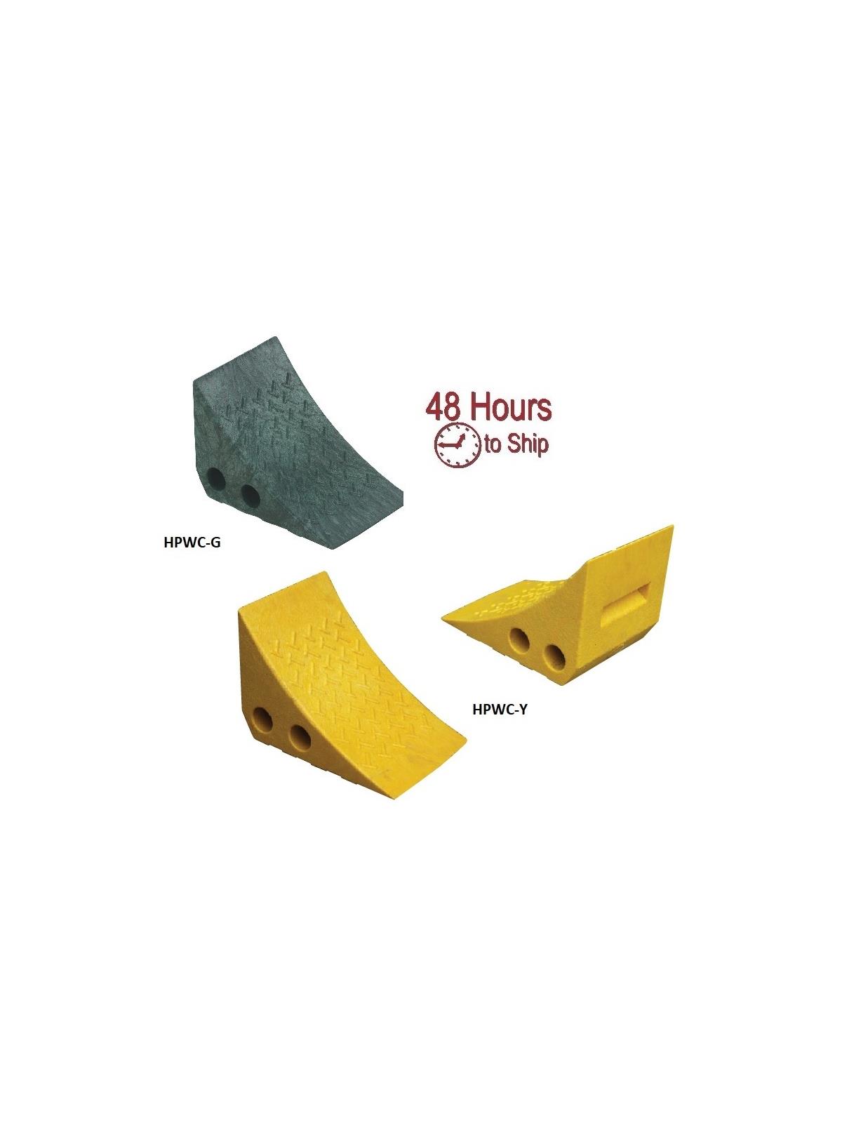 These plastic wheel chocks are durable yet light enough to take along when you travel. Made of 100% recycled plastic. Resistant to damage from sunlight, oil, salt and chemicals. FOB Shipping Point.