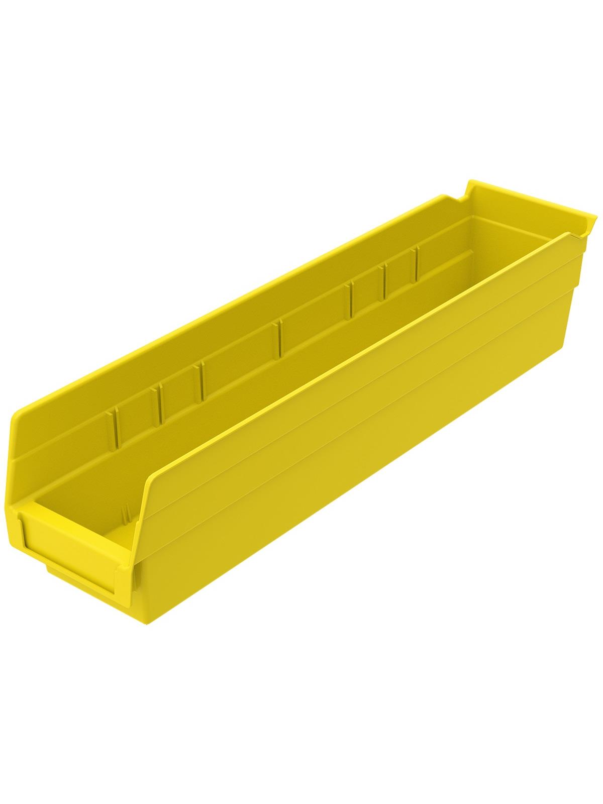 Outlasts corrugated bins - pays for themselves in reduced replacement costs. One-piece construction is waterproof and unaffected by grease or oil. Works with 12", 18" and 24" deep shelving, or vertical storage and retrieval units. Labels available. Available in 22 sizes and five colors - Red, Yellow, Blue, Green, or Semi-Clear. FOB Shipping Point.