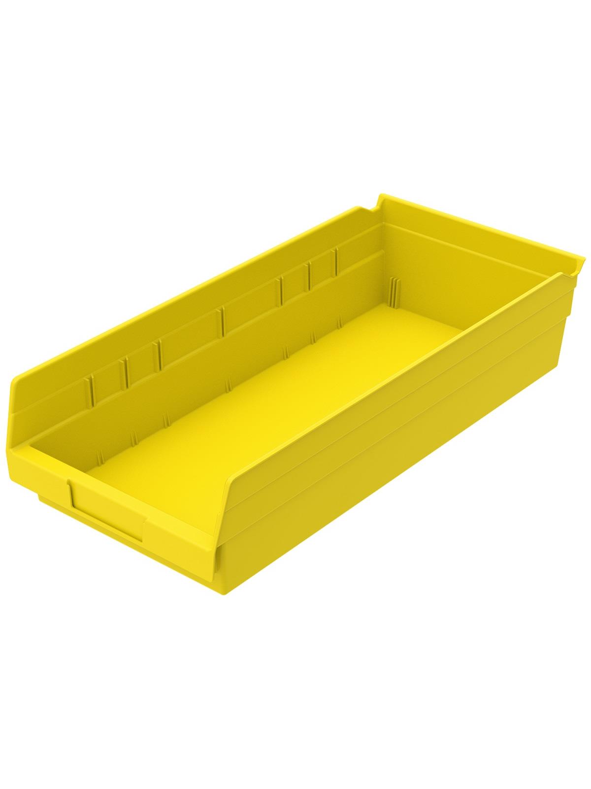 Outlasts corrugated bins - pays for themselves in reduced replacement costs. One-piece construction is waterproof and unaffected by grease or oil. Works with 12", 18" and 24" deep shelving, or vertical storage and retrieval units. Labels available. Available in 22 sizes and five colors - Red, Yellow, Blue, Green, or Semi-Clear. FOB Shipping Point.