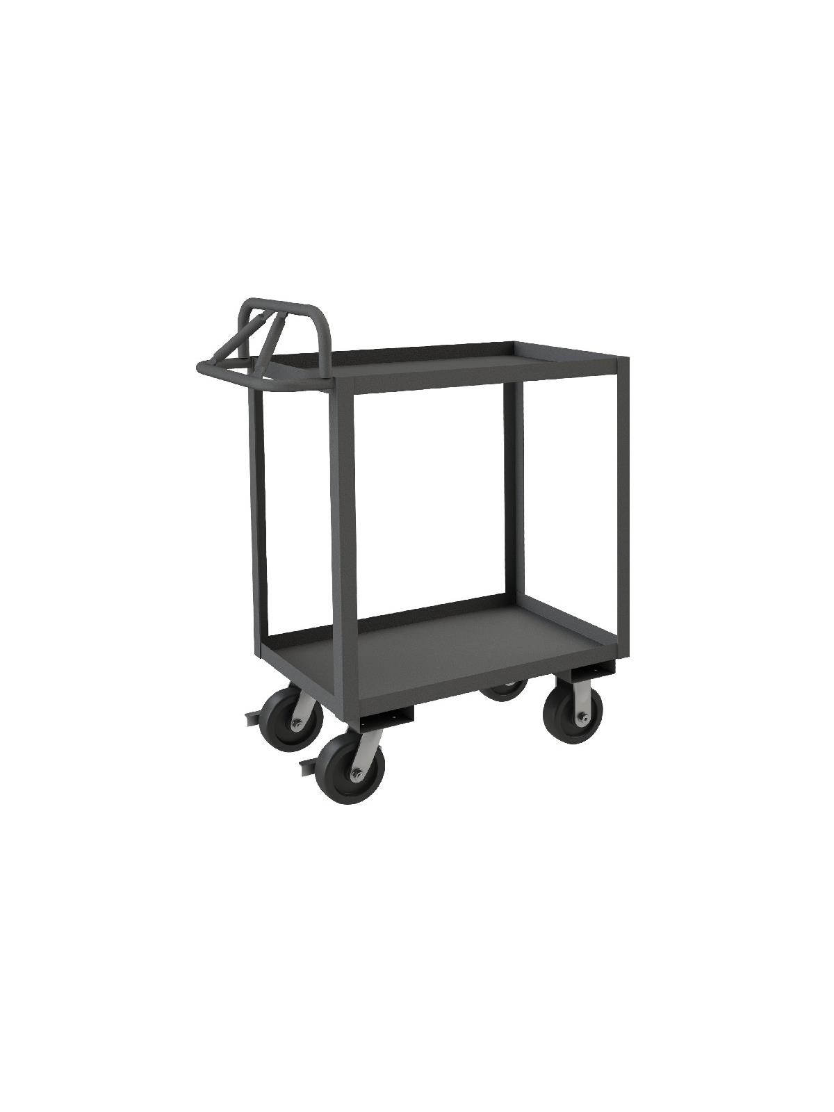 Constructed with 1-1/2" x 1/8" angle iron uprights for added strength. Heavy duty 14 gauge steel shelves. Sturdy, tubular, ergonomic handle has 3 positions ensuring maximum comfort. Standard units have 1-1/2" lips. ALD units have all lips down, TLD units have top lips down. Durable, gray, textured powder coat finish. FOB Shipping Point.