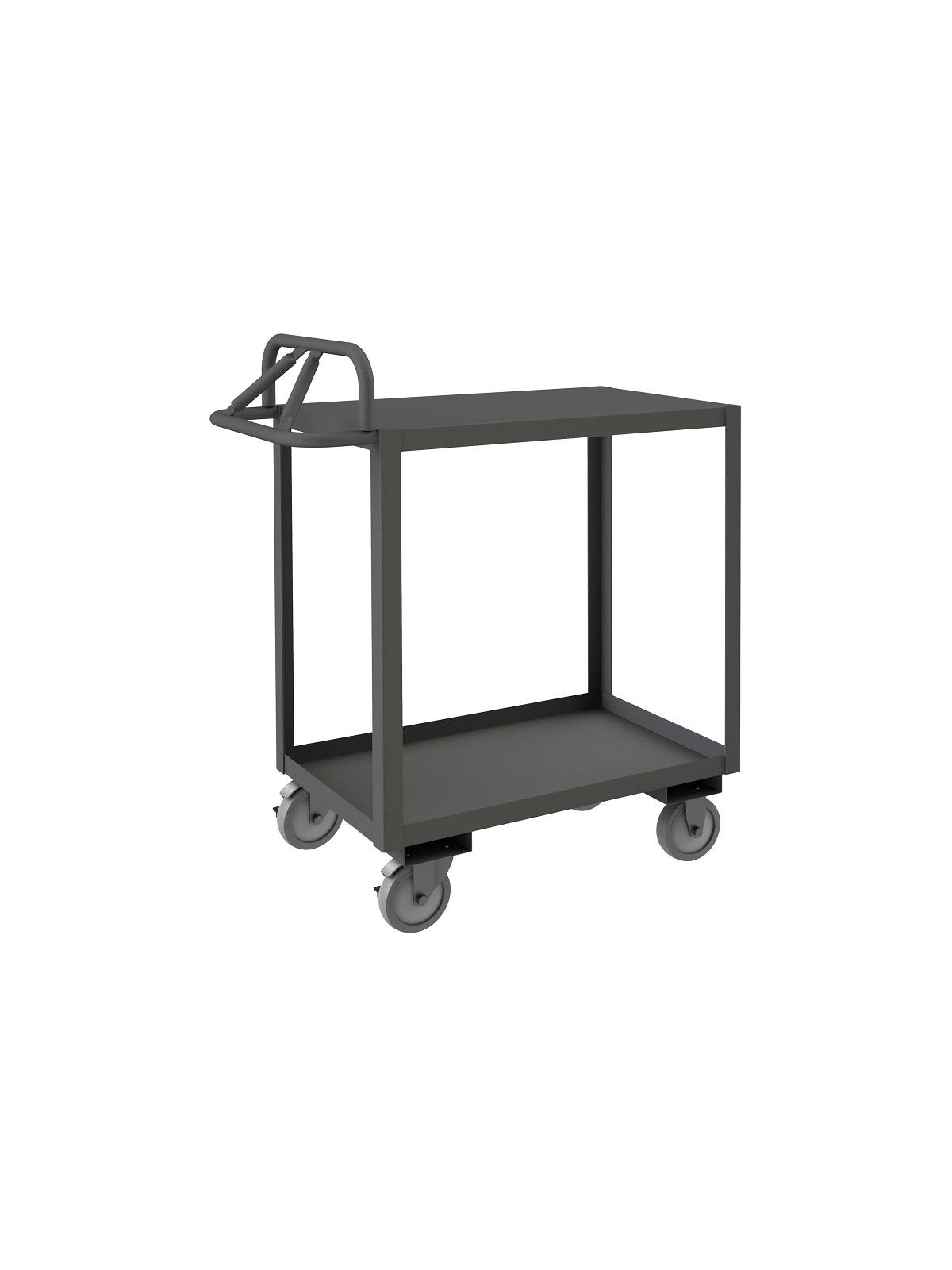 Constructed with 1-1/2" x 1/8" angle iron uprights for added strength. Heavy duty 14 gauge steel shelves. Sturdy, tubular, ergonomic handle has 3 positions ensuring maximum comfort. Standard units have 1-1/2" lips. ALD units have all lips down, TLD units have top lips down. Durable, gray, textured powder coat finish. FOB Shipping Point.
