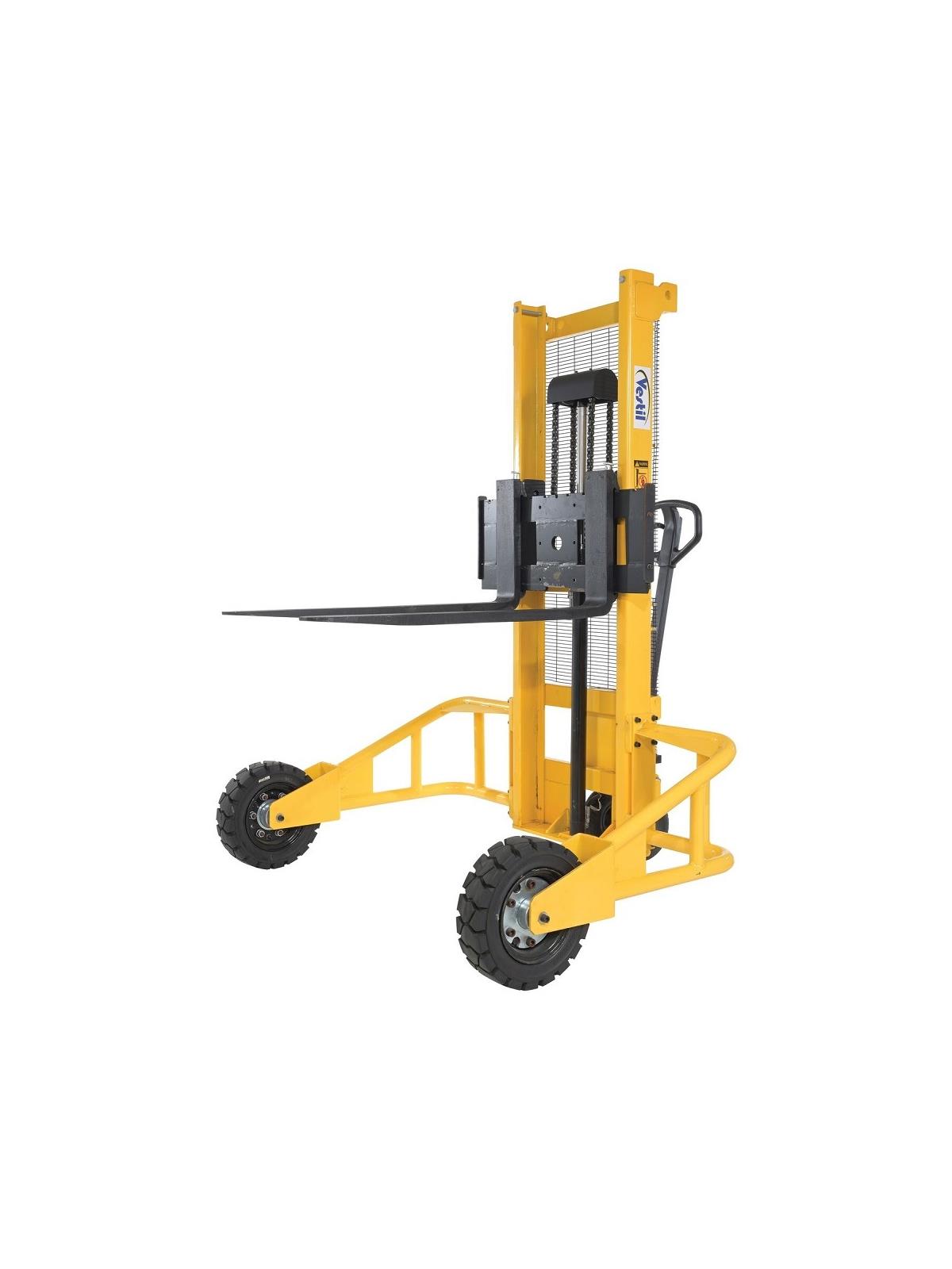 Manual Rough Terrain Stackers are capable of going where other stackers can't. The manual design benefits the user by giving precise movement of the unit in particular areas. A simple handle pump lifts and lowers, without the need for mechanical power. Just a simple hydraulic action leads the forks up or down to the desired height. The rubber tires provide stability when traversing rough or uneven surfaces. Baked in yellow powder coat finish.