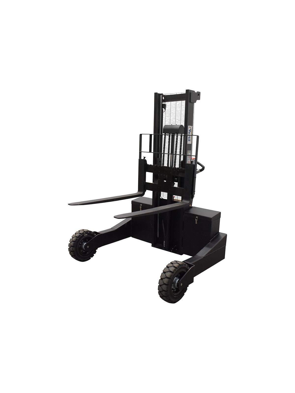 Powered Rough Terrain Stackers feature a multi-function driving handle featuring an infinite speed adjustment, simple controls for finding the perfect height, and an emergency reverse function. Forks are adjustable to precisely fit what is being maneuvered. Equipped with (2) 12V batteries, integral battery charger, and battery level indicator.