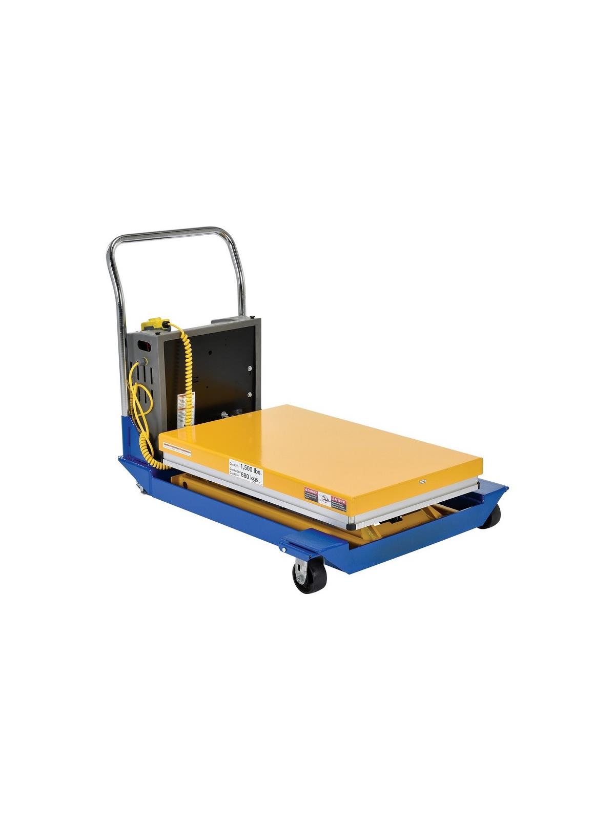Electric motor is rated at 1600 watts. Operates on 12V DC power. Battery is 12V deep cycle for maximum life. Built-in battery charger is included (operated on 115V AC power). Includes UP and DOWN push-buttons built into power unit. Platform equipped standard with perimeter pinch-point guard for OSHA compliance. Includes 2 rigid and 2 swivel 4" x 2" phenolic casters with brakes. Push handle is removable. Includes an industry-best powder coat finish. FOB Shipping Point.