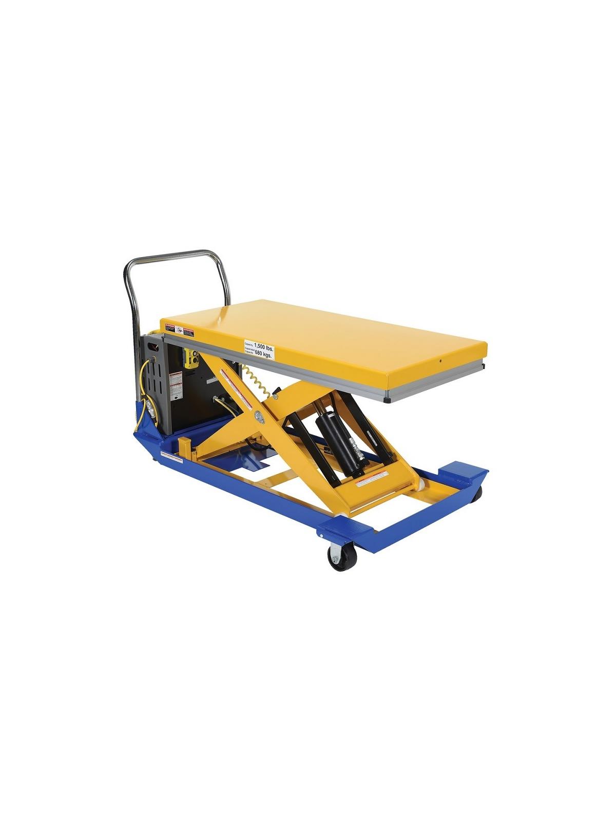 Electric motor is rated at 1600 watts. Operates on 12V DC power. Battery is 12V deep cycle for maximum life. Built-in battery charger is included (operated on 115V AC power). Includes UP and DOWN push-buttons built into power unit. Platform equipped standard with perimeter pinch-point guard for OSHA compliance. Includes 2 rigid and 2 swivel 4" x 2" phenolic casters with brakes. Push handle is removable. Includes an industry-best powder coat finish. FOB Shipping Point.