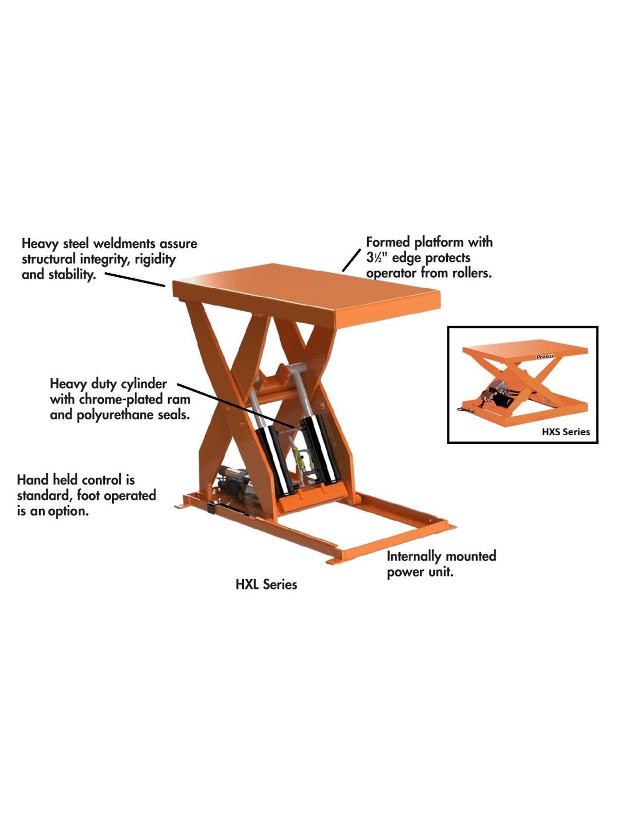 Engineered and designed for smooth, easy operation and durability. Eliminates bending, lifting, and helps prevent back injuries. Industrial-duty construction includes 1/2" plate steel scissor legs, lifetime lubricated bearings, hydraulic cylinders with chrome-plated rams, and polyurethane seals. Hinged top for easy access to internally mounted motor, pumps and oil reservoir. FOB Shipping Point.