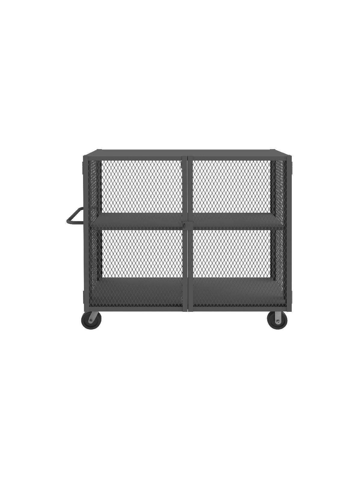 14 gauge steel construction. Punched diamond pattern on sides and front. Interior storage area is 48"H. 3-point handle has provisions for pad-lock (pad-lock not included). Rolls on 6" x 2" phenolic bolt-on casters, (2) swivel, and (2) rigid. Durable, textured gray powder coat finish. Includes one adjustable shelf. FOB Shipping Point.