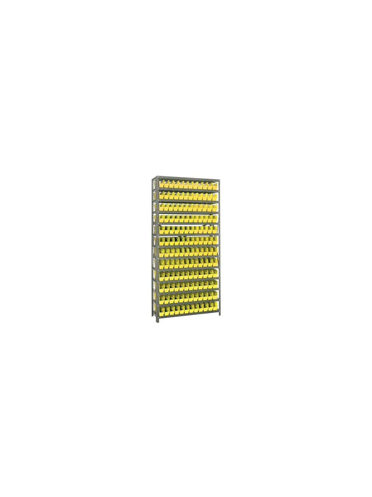 Rugged 350 lb. capacity per shelf, standard shelving unit will keep parts organized and readily accessible. Gray enamel finish will not rust or corrode. 12-HQSB100, 8-HQSB101, 5-HQSB102, 4-HQSB107, 3-HQSB109 fit across a standard 36"W x 12"D shelf. 8-HQSB103, 5-HQSB104, 4-HQSB108, 3-HQSB110 fit across a 36"W x 18"D shelf. Bins are available in Blue, Yellow, Red, Green, Ivory or Black. FOB Shipping Point.
