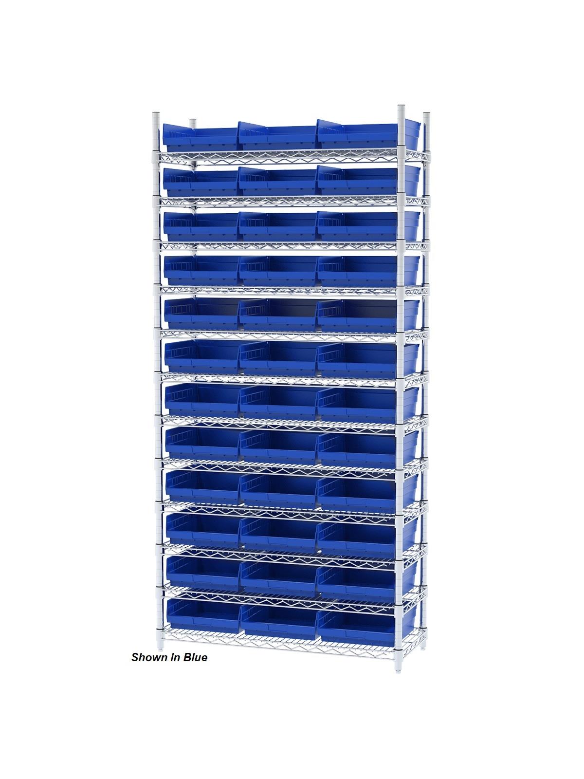 Shelf Bin Wire Systems can be configured for use with 36, 48, 60 or 96 bins providing a versatile system for storage and material handling. Durable and strong polypropylene shelf bins outlast corrugated bins. Bins available in Blue, Red, Yellow, or Semi-Clear. FOB Shipping Point.