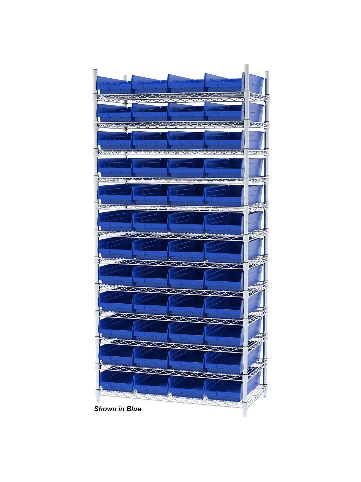 Shelf Bin Wire Systems can be configured for use with 36, 48, 60 or 96 bins providing a versatile system for storage and material handling. Durable and strong polypropylene shelf bins outlast corrugated bins. Bins available in Blue, Red, Yellow, or Semi-Clear. FOB Shipping Point.