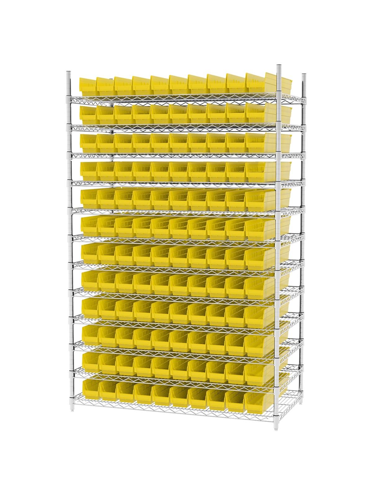 Shelf Bin Wire Systems can be configured for use with 36, 48, 60 or 96 bins providing a versatile system for storage and material handling. Durable and strong polypropylene shelf bins outlast corrugated bins. Bins available in Blue, Red, Yellow, or Semi-Clear. FOB Shipping Point.
