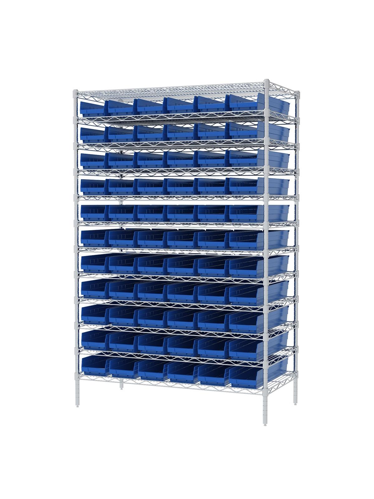 Shelf Bin Wire Systems can be configured for use with 36, 48, 60 or 96 bins providing a versatile system for storage and material handling. Durable and strong polypropylene shelf bins outlast corrugated bins. Bins available in Blue, Red, Yellow, or Semi-Clear. FOB Shipping Point.