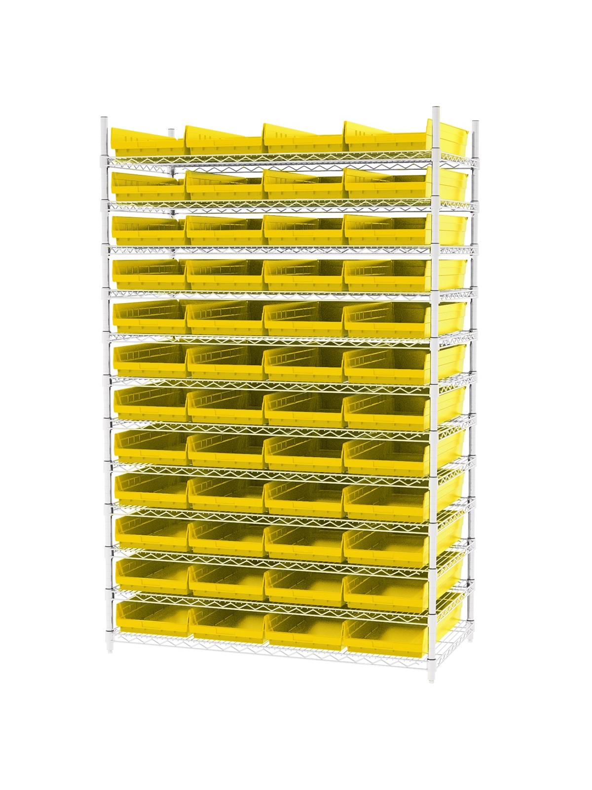 Shelf Bin Wire Systems can be configured for use with 36, 48, 60 or 96 bins providing a versatile system for storage and material handling. Durable and strong polypropylene shelf bins outlast corrugated bins. Bins available in Blue, Red, Yellow, or Semi-Clear. FOB Shipping Point.