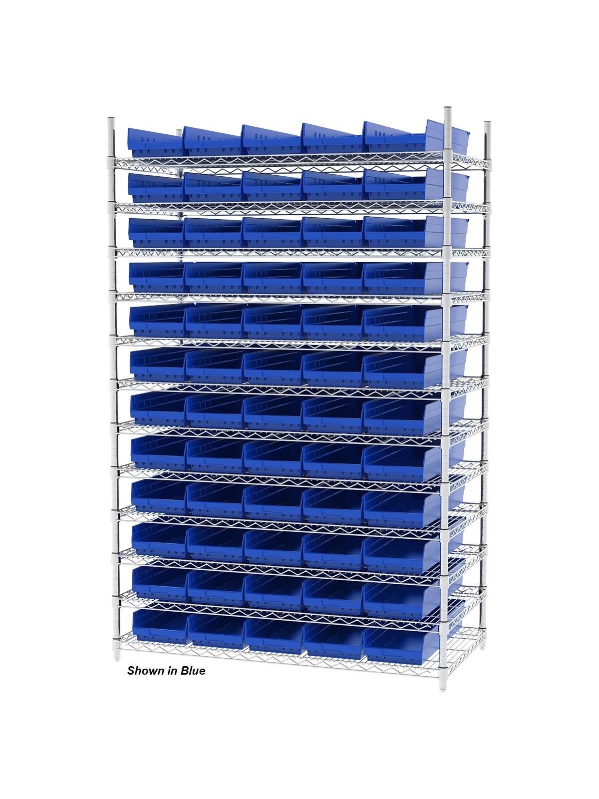 Shelf Bin Wire Systems can be configured for use with 36, 48, 60 or 96 bins providing a versatile system for storage and material handling. Durable and strong polypropylene shelf bins outlast corrugated bins. Bins available in Blue, Red, Yellow, or Semi-Clear. FOB Shipping Point.